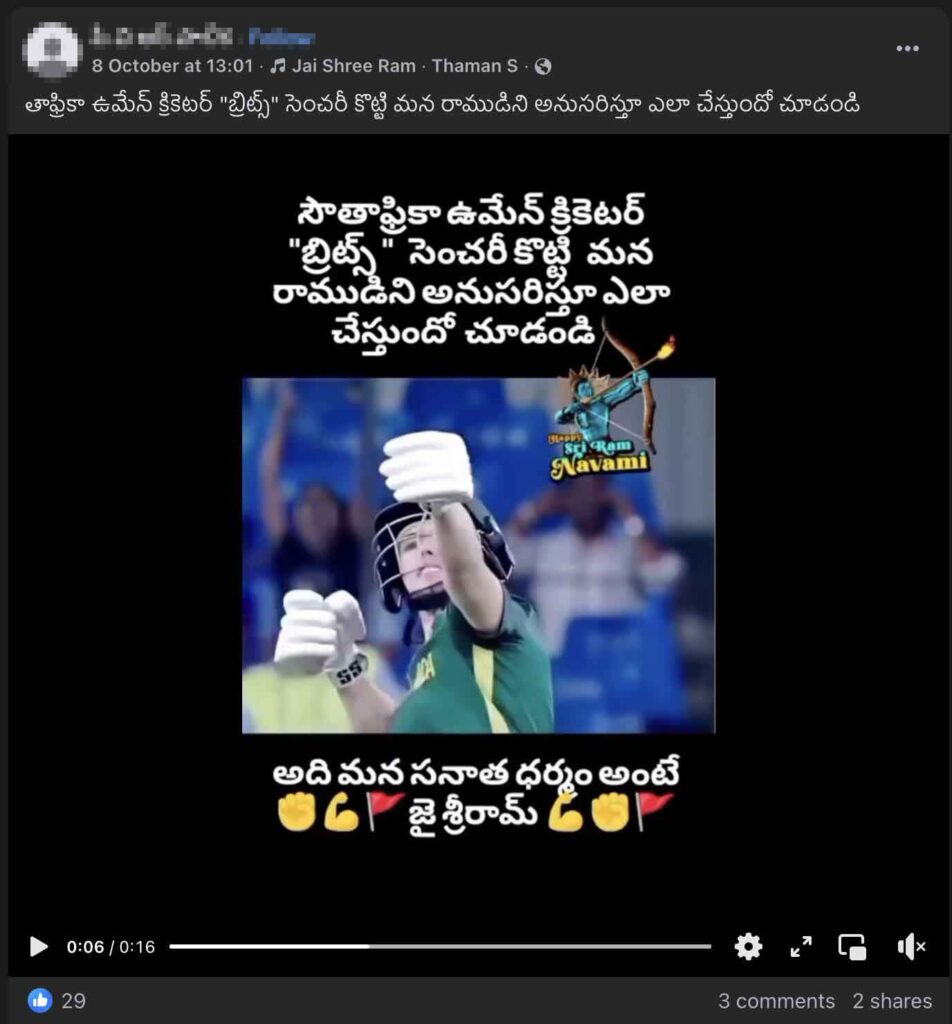 చివరగా, 2025 మహిళల క్రికెట్ ప్రపంచ కప్ సందర్భంగా దక్షిణాఫ్రికా క్రికెటర్ తజ్మిన్ బ్రిట్స్ చేసిన మహ్మద్ మహమ్మద్ సలా సెలబ్రేషన్ వీడియోను, ఆమె శ్రీరాముణ్ణి అనుకరిస్తూ ఇలా చేశారని తప్పుగా షేర్ చేస్తున్నారు.