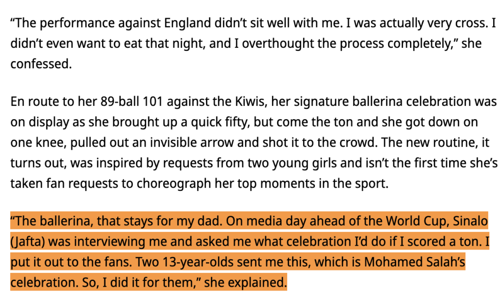 ఈ కథనం ప్రకారం తనకి ఒక సిగ్నేచర్ సెలబ్రేషన్ (బ్యాలరీన సెలబ్రేషన్) ఉంది. అయితే వరల్డ్ కప్ మ్యాచ్కు ముందు జరిగిన ఒక మీడియా డే సందర్భంగా, తను సెంచరీ చేస్తే ఏ సెలబ్రేషన్ చేస్తారని తన టీమ్ మేట్ సైనాలో జాఫ్తా అడిగితే, తను ఏ సెలబ్రేషన్ చెయ్యాలో అని ఆమెఫ్యాన్స్ను కోరుకుంది. ఇద్దరు 13-ఏళ్ల బాలికలు దీన్ని ఎన్నుకున్నారని, అందుకే ఆమె ఈ సెలబ్రేషన్ చేసారాని స్పోర్ట్స్స్టార్తో కథనంలో ఉంది. దీని గురించి ప్రచురించబడిన మరి కొన్ని వార్తా కథనాలను మీరు ఇక్కడ, ఇక్కడ, ఇక్కడ చూడవచ్చు.