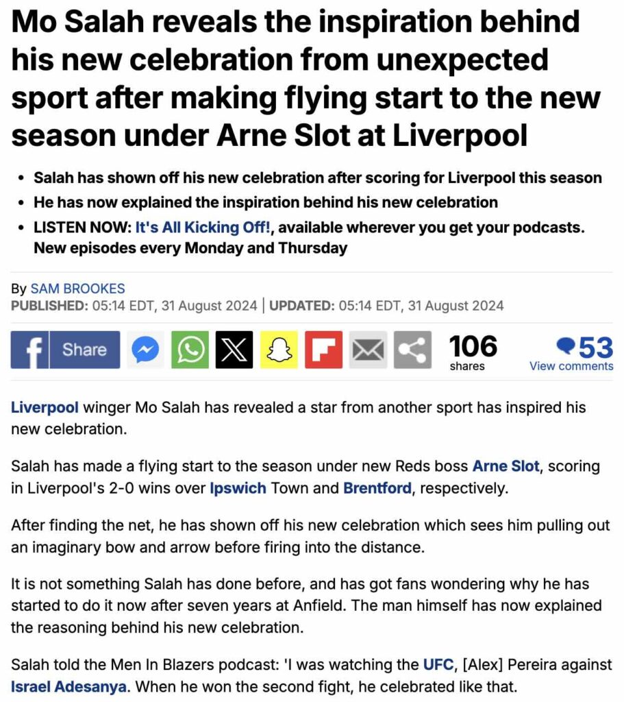 ‘Men in Blazers’ అనే యూట్యూబ్ ఛానల్కి ఇచ్చిన ఇంటర్వ్యూలో మహమ్మద్ సలా మాట్లాడుతూ, UFC (Ultimate Fighting Championship) ఫైటర్ ఇజ్రాయెల్ అడెసాన్యా ఒక ఫైట్లో గలిచిన తర్వాత ఇలా చేయడాన్ని చూసి, అది నచ్చి తను ఈ సెలబ్రేషన్ చేశాడని పేర్కొన్నాడు.
