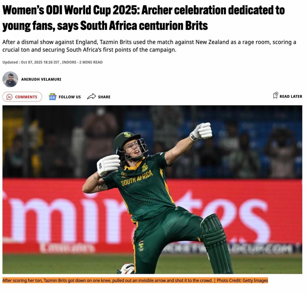 అలాగే, స్పోర్ట్స్స్టార్ సంస్థ వారు ఈ మ్యాచ్లో తజ్మిన్ బ్రిట్స్ కొట్టిన సెంచరీ తర్వత చేసిన సెలబ్రేషన్ గురించి ప్రచురించిన ఒక కథనంలో, ఇద్దరు 13 ఏళ్ల బాలికల కోరిక మేరకు తాను ఇలా సెలబ్రేట్ చేశారని ఆమె చెప్పారని పేర్కొన్నారు.