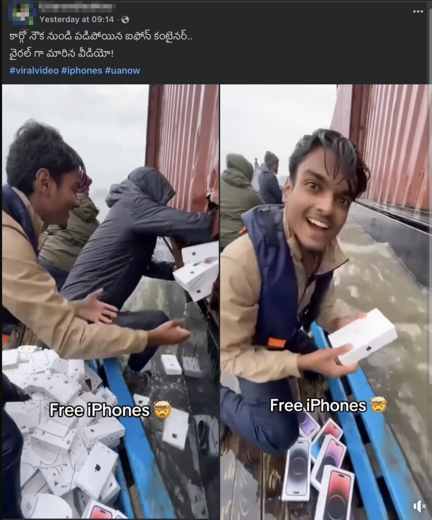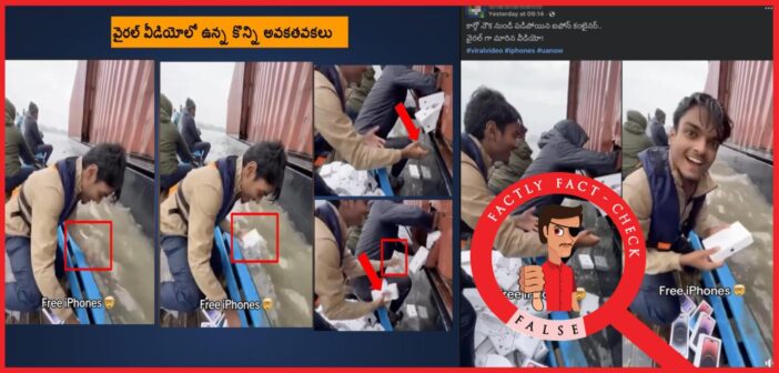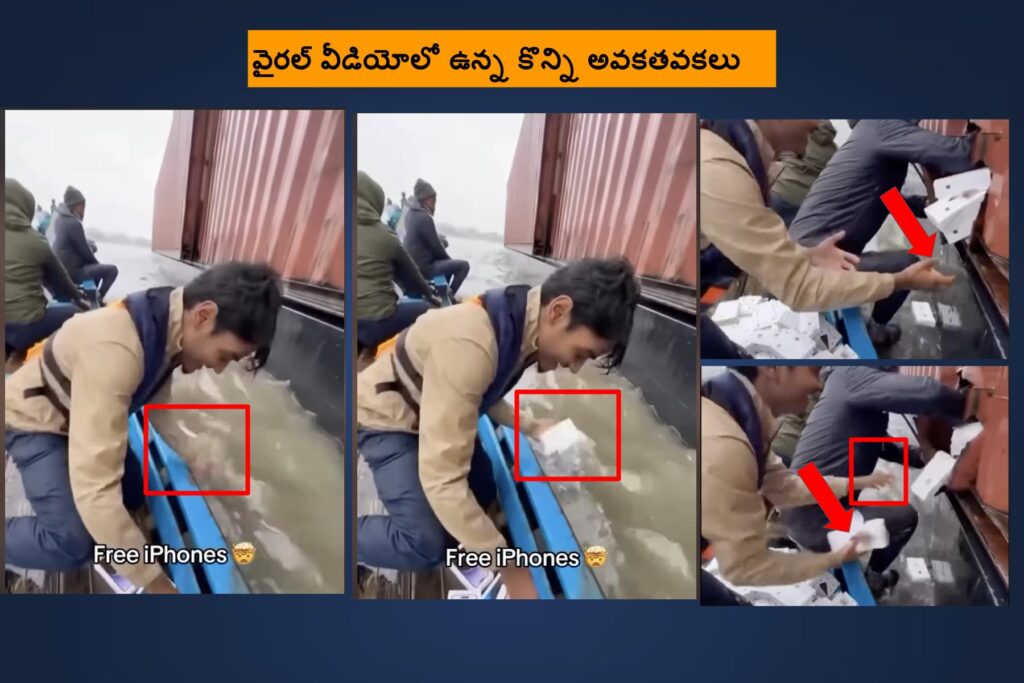 ఒక కార్గో నౌక నుంచి ఐఫోన్ కంటైనర్ పడిపోయిందని క్లెయిమ్ చేస్తూ ఆ కంటైనర్ దగ్గరకు కొందరు ఒక పడవలో వెళ్లి ఆ ఐఫోన్లను తీసుకుంటున్న వీడియో (ఇక్కడ, ఇక్కడ) ఒకటి సోషల్ మీడియాలో షేర్ చేయబడుతోంది. అసలు ఈ క్లెయిమ్ వెనుక ఎంత నిజం ఉందో ఈ ఆర్టికల్ ద్వారా చూద్దాం.