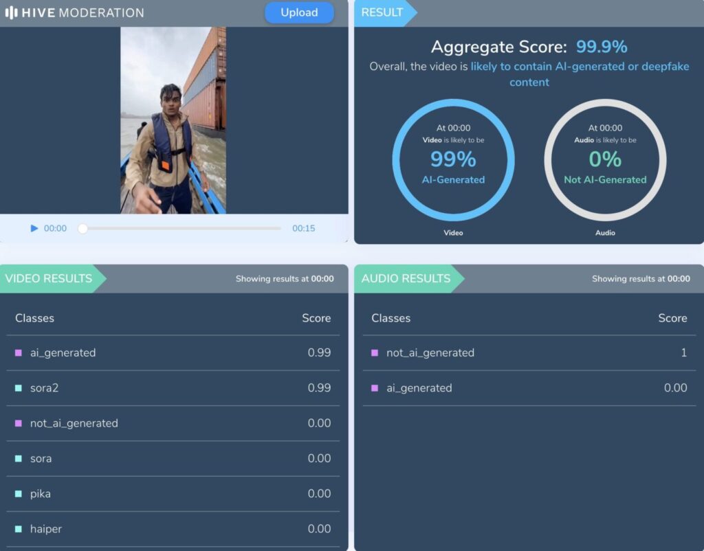 ఇదే విషయాన్ని నిర్ధారించుకోవడానికి, వైరల్ వీడియోను హైవ్ అనే AI-కంటెంట్ డిటెక్షన్ టూల్ ఉపయోగించి చూసాము. ఈ వీడియో పూర్తిగా AI-ఉపయోగించి తయారు చేసినదని హైవ్ గుర్తించింది.