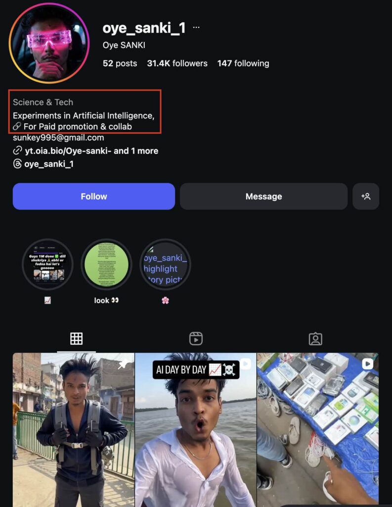 Oye_sanki_1 అనే పేజీలో ఈ వీడియోను 29 నవంబర్ 2025న అప్లోడ్ చేశారు. ఈ పేజీ యొక్క బయోలో ‘Experiments in Artificial Intelligence’ అని స్పష్టంగా రాసి ఉంది. అంటే ఈ పేజీలో ఉన్న వీడియోలో AI-జనరేటెడ్ అని మనకు దీనిబట్టి స్పష్టం అవుతుంది. ఈ వీడియోతో పాటు మరిన్ని ఇటువంటి AI-జనరేటెడ్ వీడియోలు, నిజమైన దృశ్యాలు అని చెప్తూ సోషల్ మీడియాలో ప్రస్తుతం వైరల్ అవుతున్నాయి (ఇక్కడ, ఇక్కడ). ఇవన్నీ నిజమైన వీడియోలు కాదని చెప్తూ మేము ఒక ఫ్యాక్ట్ చెక్ కథనం ప్రచురించాము.