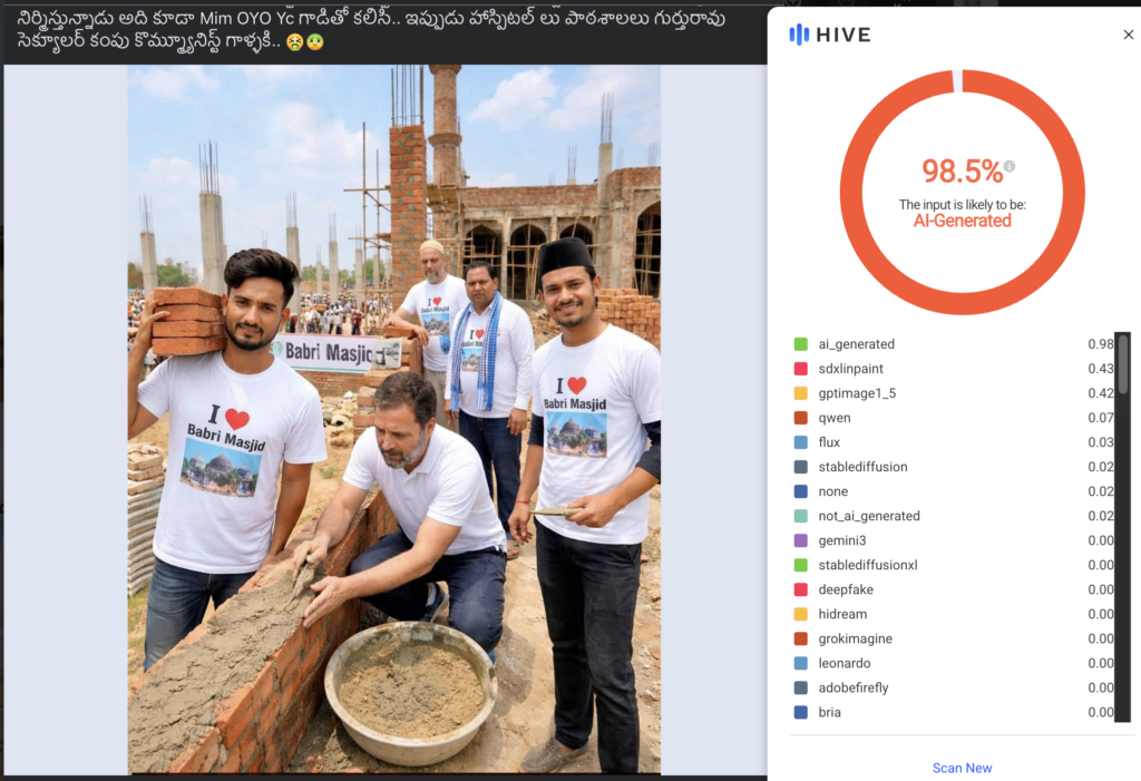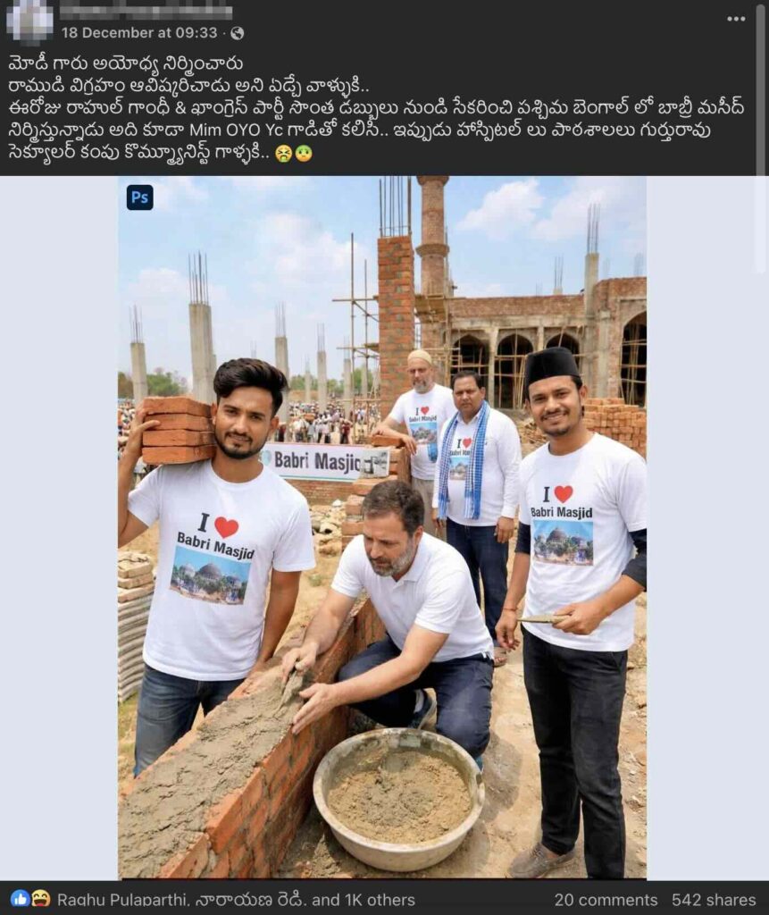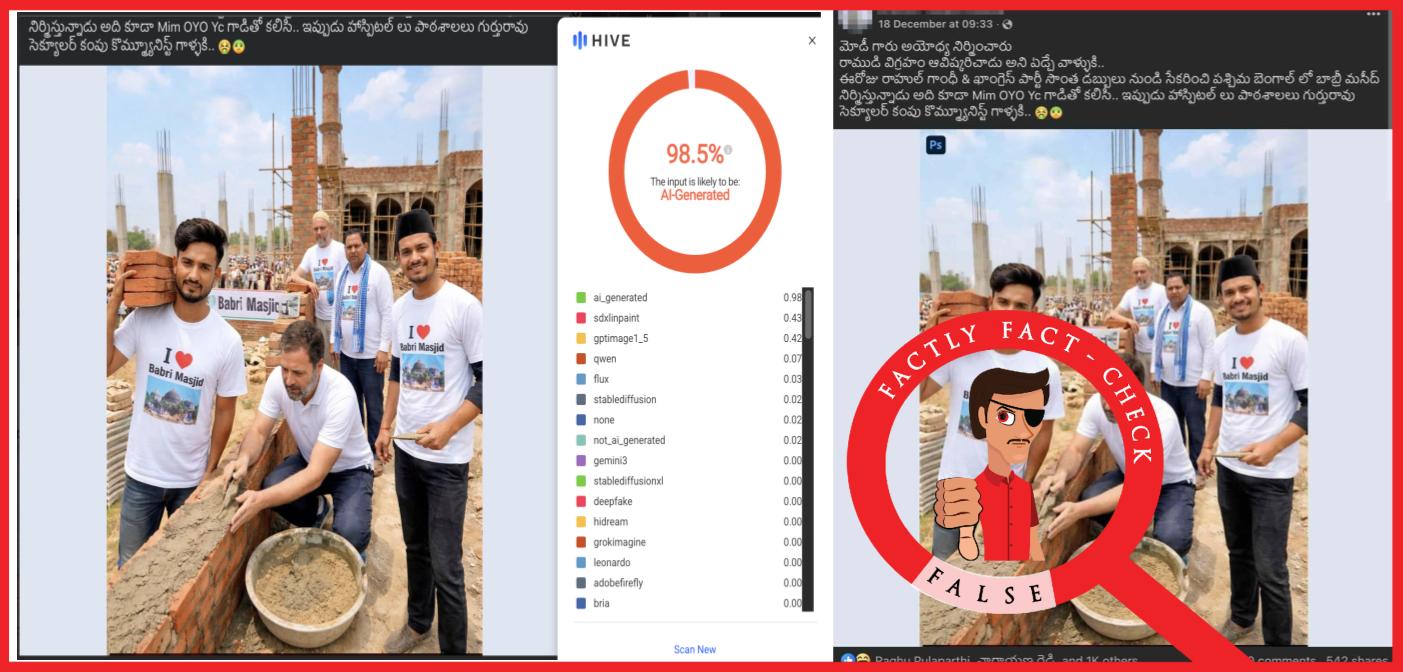 చివరగా, రాహుల్ గాంధీ, అసదుద్దీన్ ఒవైసీ పశ్చిమ బెంగాల్లో నిర్మిస్తున్న ‘బాబ్రీ మసీదు తరహా’ మసీదు నిర్మాణంలో పాల్గొన్నారని చెప్తూ ఒక AI-జనరేటెడ్ ఇమేజ్ షేర్ చేస్తున్నారు.