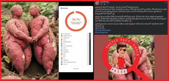 చివరగా, ఆంధ్రప్రదేశ్లోని అల్లూరి సీతారామరాజు జిల్లాలో ఒక రైతు పొలంలో మనుషుల రూపంలో ఉన్న చిలకడదుంపలు పండాయని చెప్తూ, AIతో తయారు చేసిన ఫోటో షేర్ చేస్తున్నారు.