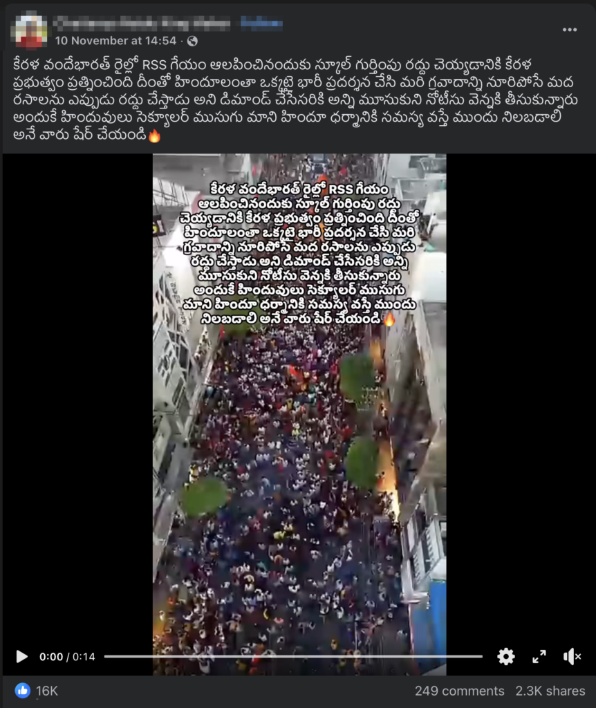 క్లెయిమ్: నవంబర్ 2025లో ఎర్నాకులం-బెంగళూరు మధ్య ప్రారంభించబడిన వందే భారత్ రైల్లో సరస్వతి విద్యాలయ స్కూల్ విద్యార్థులు పాడిన పాట ‘RSS గేయం’ అని చెప్తూ ఆ స్కూల్ పైన కేరళ ప్రభుత్వం చేపట్టిన దర్యాప్తుకు వ్యతిరేకంగా కేరళలో జరిగిన ఒక ప్రదర్శనకు చెందిన వీడియో.