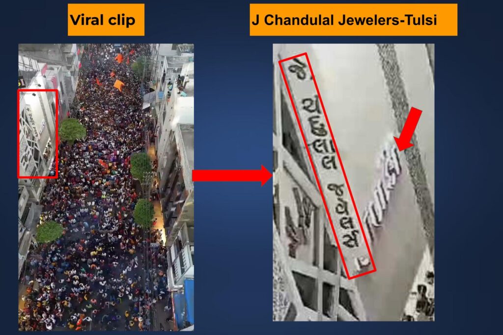 ఈ 2023 నాటి యూట్యూబ్ పోస్టులో, వైరల్ వీడియో కంటే మంచి క్వాలిటీ వెర్షన్ ఉంది. ఈ వీడియోలో మొదటి ఫ్రేములో మనం ఎడమ పక్కన ఒక బిల్డింగ్ చూడవచ్చు. దాని పైన ‘Tulsi’ అని రాసి ఉంది. అలాగే, ‘જે. ચંદુલાલ જ્વેલર્સ’ అని గుజరాతీ భాషలో రాసి ఉన్న ఒక బోర్డు కూడా ఆ బిల్డింగ్ పైన ఉంది. దీన్ని గూగుల్ ట్రాన్సలేట్ ఉపయోగించి ఆంగ్లంలోకి అనువదించి చూడగా అది ‘J Chandulal Jewelers’ అని మాకు తెలిసింది.