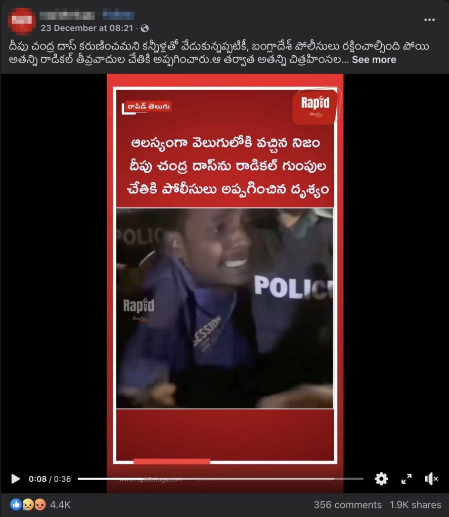 క్లెయిమ్: బంగ్లాదేశ్ పోలీసులు దీపు చంద్ర దాస్ను అతని మరణానికి ముందు ఒక మూకకి అప్పగిస్తున్న దృశ్యాలను చూపిస్తున్న వీడియో ఇది.