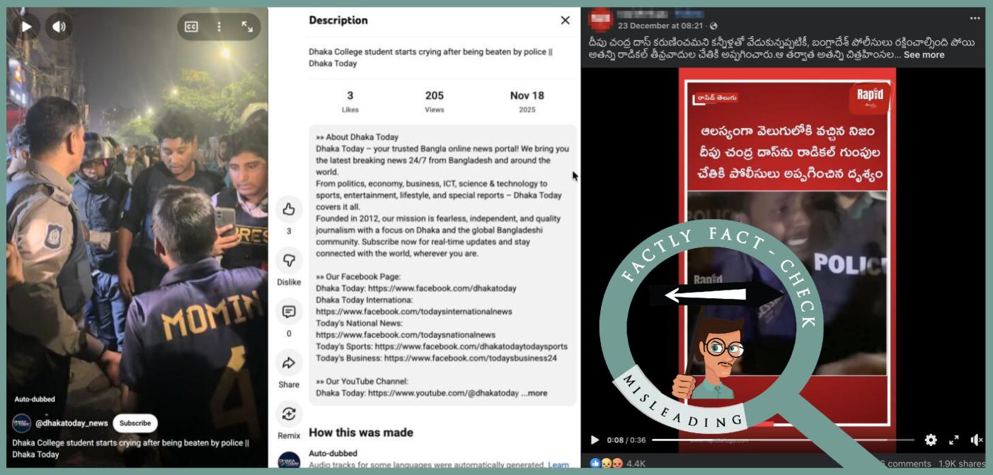 ఫ్యాక్ట్(నిజం): నవంబర్ 2025లో ఒక ఢాకా కళాశాల (Dhaka College) విద్యార్థిని, ఢాకా పోలీసులు అదుపులోకి తీసుకుంటున్న సంఘటనకు చెందిన వీడియో ఇది. దీపు చంద్ర దాస్ మరణానికి ముందు, పోలీసులు అతన్ని ఒక మూకకి అప్పగిస్తున్న వీడియో కాదు. దీపు చంద్ర దాస్ సంఘటన కంటే కొన్ని వారాల ముందు నుంచే ఈ వీడియో ఇంటర్నెట్లో ఉంది. కావున, ఈ పోస్ట్లో చేస్తున్న క్లెయిమ్ తప్పుదోవ పట్టించేలా ఉంది.