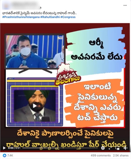 చివరిగా, భారత దేశానికి సైన్యమే అవసరం లేదని రాహుల్ గాంధీ చెప్పారంటూ క్లిప్ చేయబడిన వీడియోని షేర్ చేస్తున్నారు.