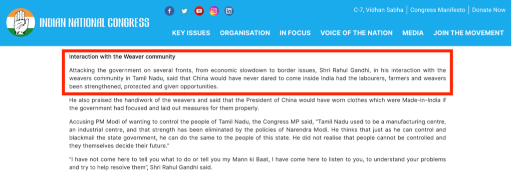 ముందుగా, వైరల్ వీడియోని రివర్స్ ఇమేజ్ సెర్చ్ చేయగా దీనికి సంబంధించిన పూర్తి వీడియో లభించింది. ఈ వీడియో కాంగ్రెస్ పార్టీ, రాహుల్ గాంధీ అధికారిక యూట్యూబ్ ఛానెళ్లలో 24 జనవరి 2021న ప్రసారం చేయబడింది. తమిళనాడులోని చేనేత కార్మికులతో రాహుల్ గాంధీ మాట్లాడడం ఈ వీడియో చూపుతుంది.