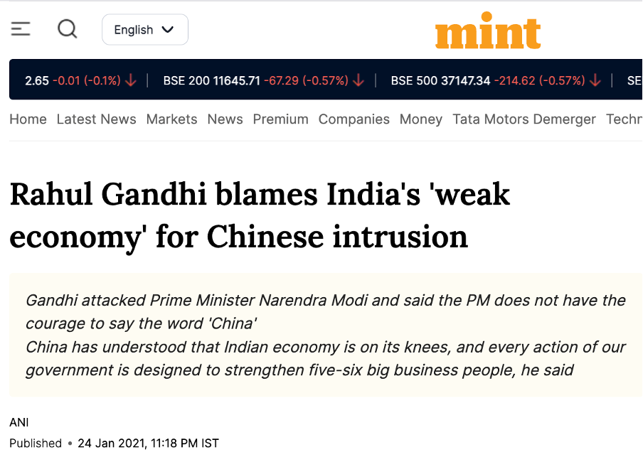 పూర్తి వీడియోలో, సరిహద్దులో చైనా ఆక్రమణ విషయంలో మోదీ ప్రభుత్వ వైఖరిని రాహుల్ గాంధీ విమర్శిస్తూ రాహుల్ గాంధీ ఈ విధంగా అన్నారు, “…ఈ మధ్య చైనా ఆర్మీ భారత భూభాగాన్ని ఆక్రమించడం గురించి మీరు వార్తాపత్రికలలో చదివే ఉంటారు. మన భూభాగంలోకి రావడానికి చైనాకి ఇంత ధైర్యం ఎక్కడినుంచి వచ్చిందో అని మనం ఆలోచించాలి. ఈరోజు భారత్ బలహీనంగా ఉందని చైనా చూడగలుగుతుంది. ‘చైనా’ అనే పదాన్ని చెప్పడానికి కూడా భారత ప్రధానికి ధైర్యం లేదు. కానీ, చైనా భారత భూభాంలోకి ప్రవేశించింది. దీనికి కారణం, భారత ఆర్థిక వ్యవస్థ చాలా బలహీనంగా ఉందని చైనాకి అర్థమైంది. మోదీ ప్రభుత్వ విధానాలు కేవలం ఐదు, ఆరు వ్యాపారుల లాభం కోసమే పనిచేస్తున్నాయని, భాతరదేశానికి నిజమైన శక్తి అయిన శ్రామికులు, కార్మికులను నాశనం చేస్తున్నాయని చైనాకి అర్థమైంది. భారత్లోని రైతులు, చేనేత కార్మికులు, శ్రామికులకు అవకాశాలు ఉండి బలమైన వారిగా ఉంటే భారత భూభాగంలోకి వచ్చే ధైర్యం చైనా చెయ్యదని నేను గ్యారెంటీ ఇస్తున్నాను. భారత్లోని రైతులు, శ్రామికులు, చిన్న పరిశ్రమలు బలంగా ఉంటే చైనా అధ్యక్షుడు భారత్లో తయారైన చొక్కాని వేసుకుంటాడని, చైనా ప్రజలు భారత కార్లు, విమానాలు కొనుక్కొని ప్రయాణిస్తారని నేను గ్యారెంటీ ఇస్తున్నాను. కానీ ఇదంతా ఎందుకు జరగట్లేదు? ఎందుకంటే భారత ప్రభుత్వం కేవలం ఐదారు వ్యాపారులకు సాయం చేస్తూ భారత్ యొక్క నిజమైన బలాన్ని నాశనం చేస్తుంది. చైనా నుంచి దేశాన్ని రక్షించడానికి భారత ప్రభుత్వం ఆర్మీ, నేవీ, ఎయిర్ ఫోర్స్ లని వాడుతుంది. కానీ, ప్రభుత్వం రైతులని, శ్రామికులు, కార్మికులను ఉపయోగించుకుంటే సరిహద్దులో సైనికులు రక్షణ కల్పించాల్సిన అవసరమే లేదు. చైనా భారత్లోకి వచ్చే ధైర్యం కూడా చెయ్యదు…”