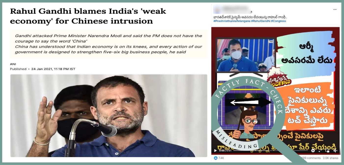 ఫాక్ట్: ఇది క్లిప్ చేయబడిన వీడియో. భారతదేశ సైనికులను కార్మికులు, శ్రామికులు, రైతులతో భర్తీ చేయాలని రాహుల్ గాంధీ చెప్పలేదు. భారత సరిహద్దుల్లో చైనా అతిక్రమణలకు భారతదేశం యొక్క ఆర్థిక బలహీనత కారణమని రాహుల్ గాంధీ సూచించారు. కార్మిక, శ్రామిక వర్గానికి సాధికారత కల్పించడం ద్వారా, భారత ఆర్థిక వ్యవస్థను బలోపేతం చేయడం ద్వారా చైనా భారతదేశాన్ని సవాలు చేసే అవకాశం తక్కువగా ఉంటుందని వ్యాఖ్యానించారు. కావున పోస్టులో చేయబడిన క్లెయిమ్ తప్పుదోవ పట్టించే విధంగా ఉంది.
