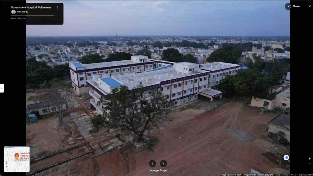 దీన్ని వెరిఫై చేయడానికి, ఈ ఆసుపత్రి ఉన్న ప్రదేశాన్ని మేము గూగుల్ మ్యాప్స్ ద్వారా చూడగా, ‘Palamaner News’ వారి వీడియోలో ఉన్న భవనం, గూగుల్ మ్యాప్స్లో ఉన్న పలమనేరు ప్రాంతీయ వైద్యశాల ఫోటో భవనం ఒకేలా ఉన్నాయని మాకు తెలిసింది