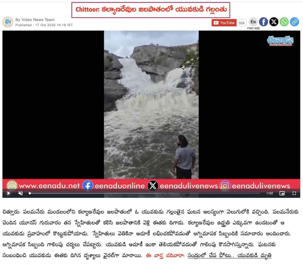 ఒక కీవర్డ్ సెర్చ్ ద్వారా, చిత్తూరు జిల్లాలోని పలమనేరులో 16 అక్టోబర్ 2025న యూనస్ అనే యువకుడు కల్యాణరేవుల జలపాతంలో దూకి గల్లంతు అయ్యాడని చెప్తున్న కొన్ని వార్తా కథనాలు (ఇక్కడ, ఇక్కడ, ఇక్కడ, ఇక్కడ) మాకు లభించాయి.