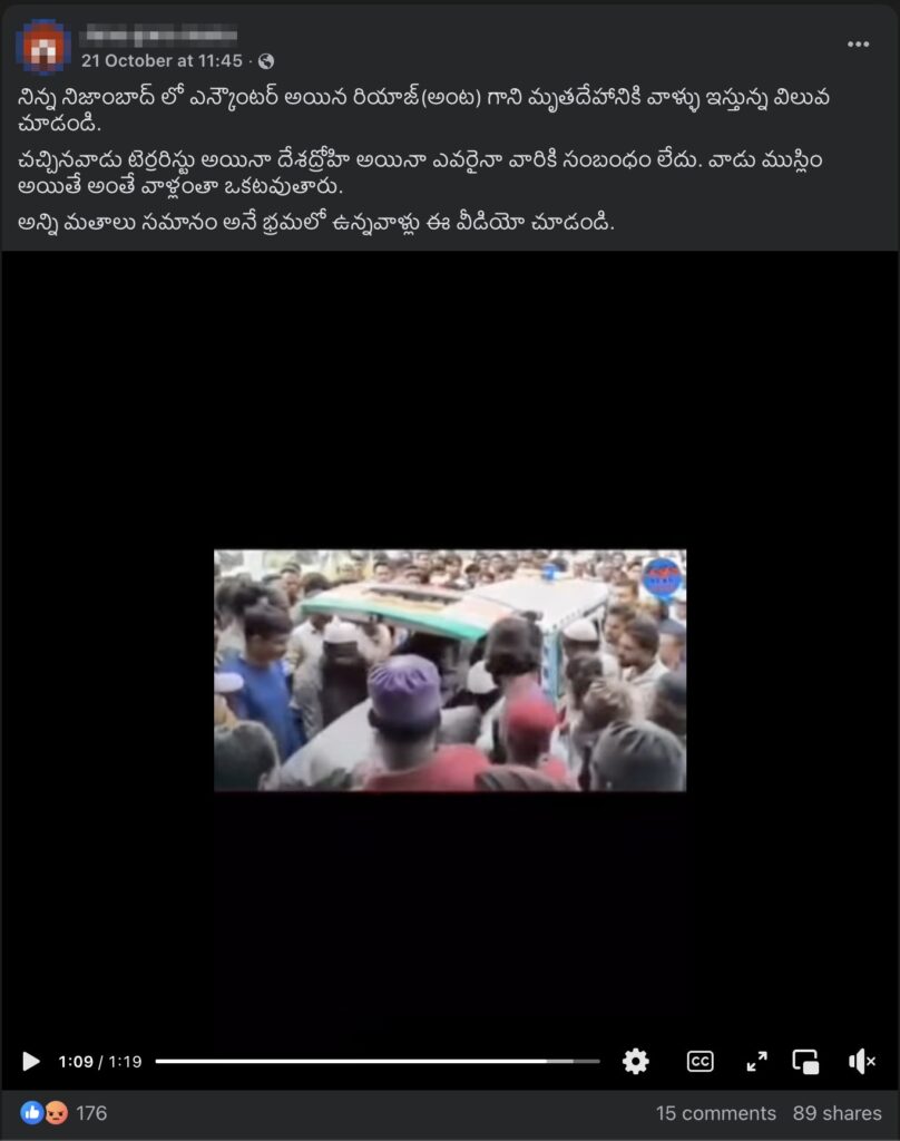 రియాజ్ మరణించిన తర్వాత, తన మృతదేహాన్ని చూడటానికి ప్రజలు ఈ వీడియోలో చూపిస్తున్నట్లు ఇంత భారీ ఎత్తున తరలి వచ్చారా, అని తెలుసుకివడానికి నిజామాబాద్ పోలీస్ కమిషనర్తో మేము ఫోన్ ద్వారా మాటడము. అయితే, తన మృతదేహాన్ని తీసుకెళ్లడానికి బంధువులు వచ్చారు కానీ భారీ ఎత్తున ఒక ఊరేగింపు లాగా ఏమీ రాలేదు అని ఆయన మాతో అన్నారు.