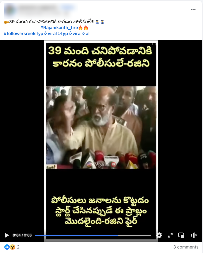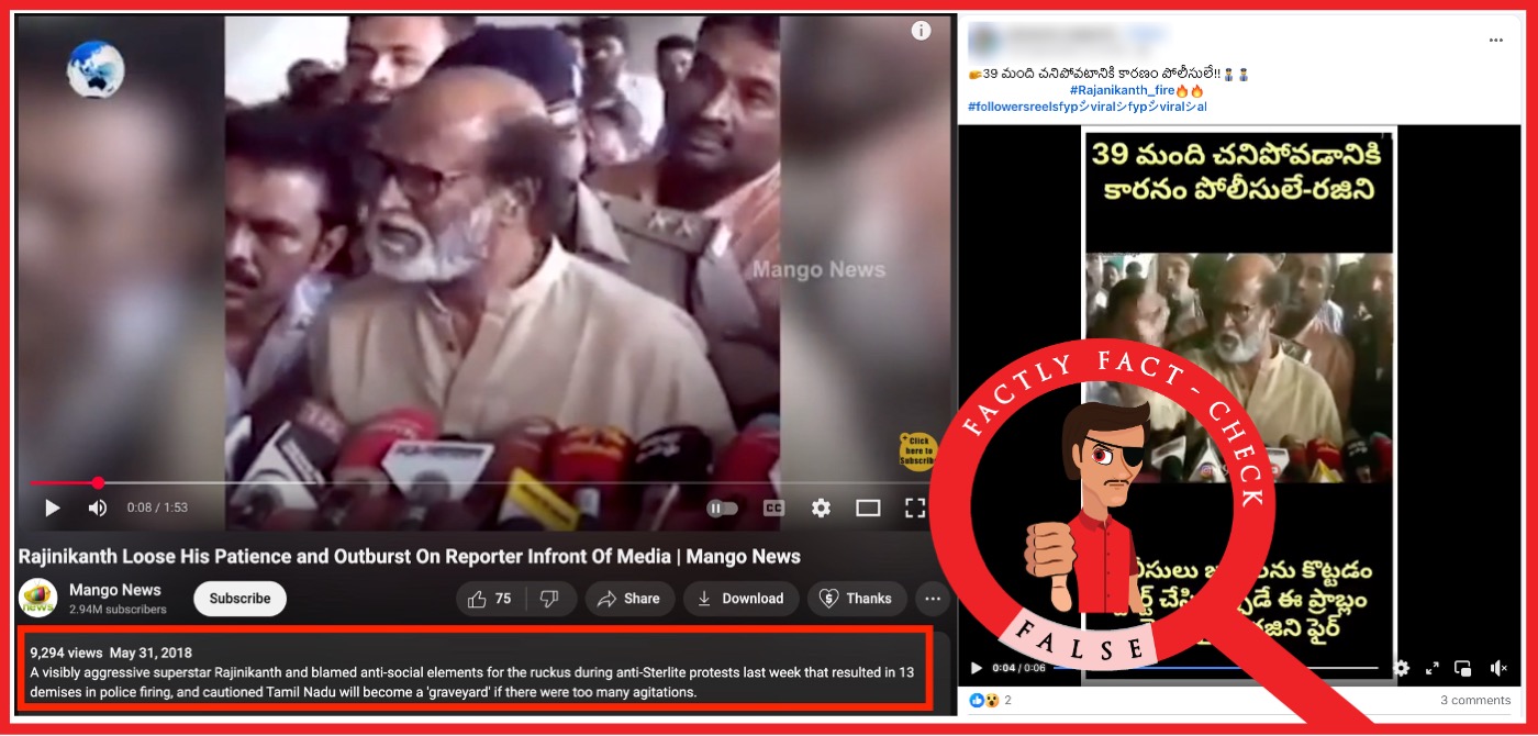 తూత్తుకుడి కాల్పులలో 13 మంది చనిపోయిన ఘటనపై రజినీకాంత్ మీడియాతో మాట్లాడుతూ, “….పోలీసులపై దాడి జరిగిన తర్వాతే ఈ సమస్య మొదలైంది. అక్కడి సంఘ వ్యతిరేక శక్తులు పోలీసులపై దాడి చేశారు…” అని పేర్కొన్నారు. దీనికి సంబంధించిన వార్త కథనాలను ఇక్కడ & ఇక్కడ చూడవచ్చు. పై ఆధారాలను బట్టి, వైరల్ వీడియోకి కరూర్ తొక్కిసలాటలో ఎటువంటి సంబంధంలేదని స్పష్టమవుతుంది.