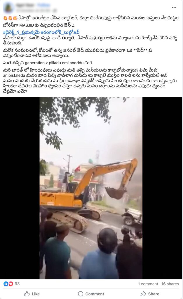 ఇటీవల 03 అక్టోబర్ 2025న నేపాల్లోని జనక్పూర్లో ఓ మసీదు వద్ద దుర్గామాత ఊరేగింపుపై రాళ్ల దాడి జరిగినట్లు పలు మీడియా సంస్థలు రిపోర్ట్ చేశాయి (ఇక్కడ, ఇక్కడ, ఇక్కడ, ఇక్కడ, & ఇక్కడ). ఈ నేపథ్యంలో,“నేపాల్లో ఆరంగేట్రం చేసిన బుల్డోజర్, దుర్గా ఊరేగింపుపై రాళ్లిసిరిన మందల ఆస్తులు నేలమట్టం,బోనస్గా MASJID (మసీదు) కు నిప్పంటించిన జెన్ Z” అంటూ వీడియో ఒకటి సోషల్ మీడియాలో వైరల్ అవుతోంది (ఇక్కడ, ఇక్కడ, & ఇక్కడ). ఈ వీడియోలో, ఒక భారీ ఎక్స్కవేటర్ కాలిపోతున్న వాహనాన్ని ధ్వంసం చేస్తున్న దృశ్యాలను మనం చూడవచ్చు. ఈ కథనం ద్వారా అందులో ఎంత నిజముందో చూద్దాం.