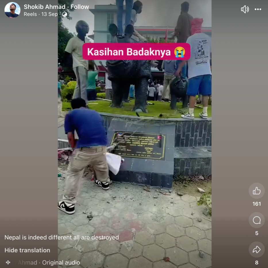 తర్వాత, వైరల్ వీడియోలోని కీఫ్రేమ్లను ఉపయోగించి ఇంటర్నెట్లో ఒక రివర్స్ ఇమేజ్ సెర్చ్ చేయగా, నవంబర్ 2025 బీహార్ అసెంబ్లీ ఎన్నికలకు ముందు, 13 సెప్టెంబర్ 2025న అప్లోడ్ చేయబడిన ఒక ఫేస్బుక్ పోస్ట్ మాకు లభించింది. ఇందులో ఇప్పుడు వైరల్ అవుతున్న అదే వీడియో ఉంది. ఆ వీడియో నేపాల్లో తీసిందని ఈ పోస్ట్ పేర్కొంది.