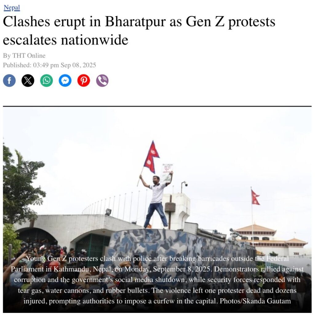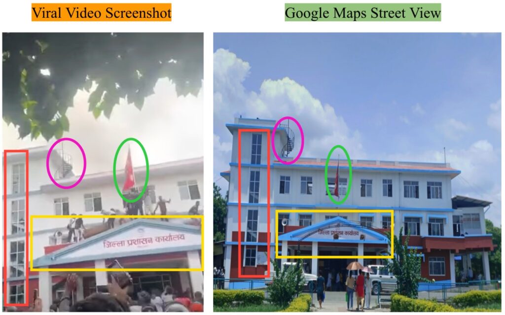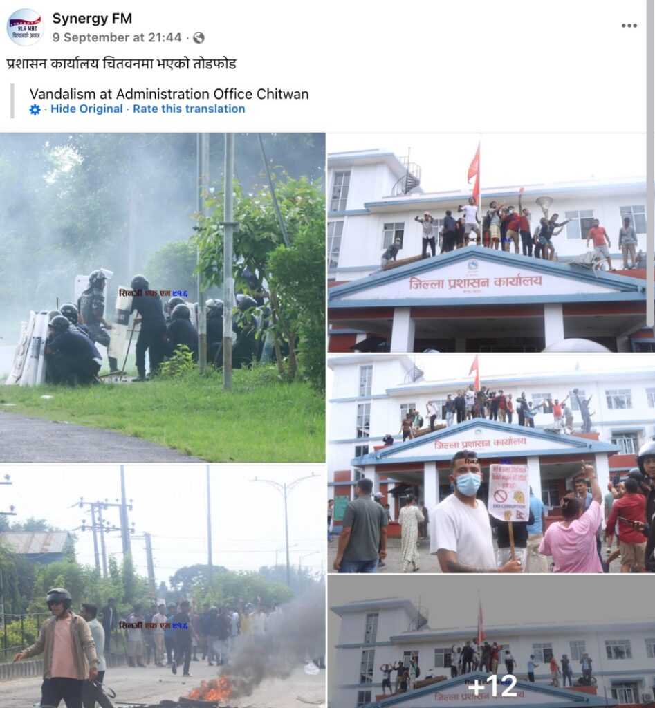 అదనంగా, ఈ వీడియో తీసిన అదే ప్రదేశంలో జరిగిన హింసాత్మక నిరసనలను చూపిస్తున్న అనేక సోషల్ మీడియా పోస్ట్లు (ఇక్కడ, ఇక్కడ) మాకు లభించాయి. ఈ పోస్ట్లలో ఒక దానిలో, వైరల్ వీడియోలో కనిపించే భవనం స్పష్టంగా కనిపించే దృశ్యాలు ఉన్నాయి. ఆ భవనంపై “నేపాల్ ప్రభుత్వం, హోం మంత్రిత్వ శాఖ, జిల్లా పరిపాలన కార్యాలయం, భరత్పూర్, చిట్వాన్” అని నేపాలీలో రాసి ఉంది.
