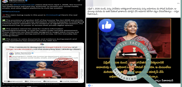 పీఐబీ ఫ్యాక్ట్ చెక్ వైరల్ పోస్టు తప్పుదారి పట్టించేదని స్పష్టం చేస్తూ, ఇన్కమ్ ట్యాక్స్ చట్టం, 2025లోని సెక్షన్ 247 నిబంధనలు పూర్తిగా శోధన (Search), సర్వే (Survey) చర్యలకే పరిమితమని తెలిపింది. పన్ను ఎగవేతకు సంబంధించిన ఆధారాలతో అధికారిక శోధన చర్యలు చేపట్టడం తప్ప, పన్ను శాఖకు వ్యక్తుల ప్రైవేట్ డిజిటల్ స్పేస్లను యాక్సెస్ చేసే అధికారం లేదని స్పష్టంగా పేర్కొంది.