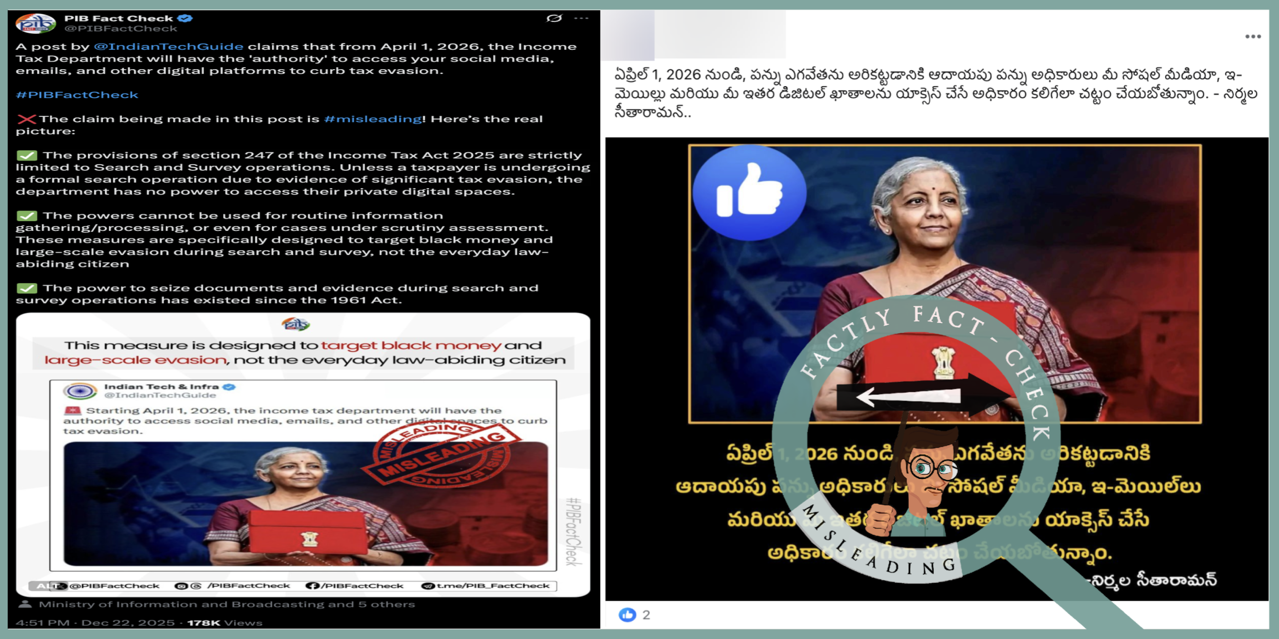 క్లైమ్: 1 ఏప్రిల్ 2026 నుండి, పన్ను ఎగవేతను అరికట్టడానికి అధికారులు సోషల్ మీడియా, ఈ-మెయిల్లు, ఇతర డిజిటల్ ఖాతాలను యాక్సెస్ చేసే అధికారం కలిగేలా చట్టం తేబోతున్న కేంద్రం.