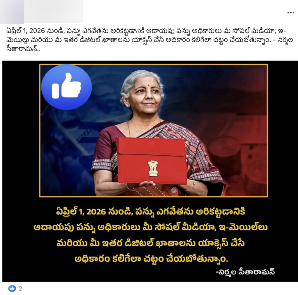 “1 ఏప్రిల్ 2026 నుండి, పన్ను ఎగవేతను అరికట్టడానికి అధికారులు మీ సోషల్ మీడియా, ఈ-మెయిల్లు, మీ ఇతర డిజిటల్ ఖాతాలను యాక్సెస్ చేసే అధికారం కలిగేలా చట్టం చేయబోతున్నాం” అని కేంద్ర ఆర్థిక మంత్రి నిర్మలా సీతారామన్ చెప్పినట్టు సోషల్ మీడియాలో(ఇక్కడ, ఇక్కడ) షేర్ చెయ్యబడుతోంది. దీని వెనుక ఉన్న నిజమెంతో ఈ కథనం ద్వారా తెలుసుకుందాం.