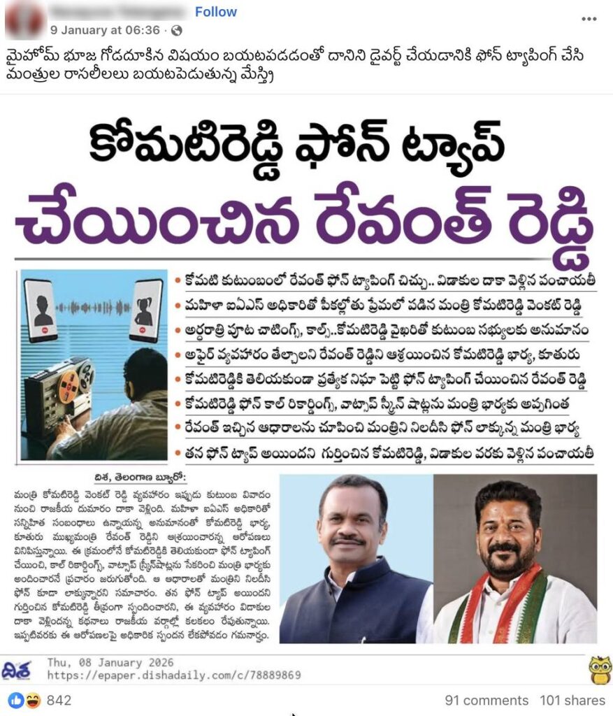 ముఖ్యమంత్రి రేవంత్ రెడ్డి, తమ ప్రభుత్వంలోని మంత్రి కోమటిరెడ్డి వెంకట్ రెడ్డి ఫోన్ను ట్యాప్ చేయించారని పేర్కొంటూ ‘దిశ డైలీ’ కథనం ప్రచురించినట్లు న్యూస్ క్లిప్ ఫోటో ఒకటి సోషల్ మీడియాలో (ఇక్కడ, ఇక్కడ & ఇక్కడ) విస్తృతంగా షేర్ అవుతోంది. ఈ కథనం ద్వారా అందులో ఎంత నిజముందో చూద్దాం.
