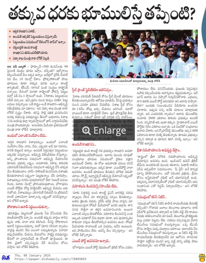 వైరల్ న్యూస్పేపర్ క్లిప్ను జాగ్రత్తగా పరిశీలించగా, క్లిప్ ఎడమ కిందభాగంలో గురువారం 08 జనవరి 2026 అనే వాటర్మార్క్తో పాటు ఒక లింక్ ఉన్నట్టు మేము గమనించాము. అంటే, ఈ న్యూస్ పేపర్ క్లిప్ ఆ తేదీన ‘దిశ డైలీ’ పత్రికలో ప్రచురితమైందని తెలుస్తోంది.