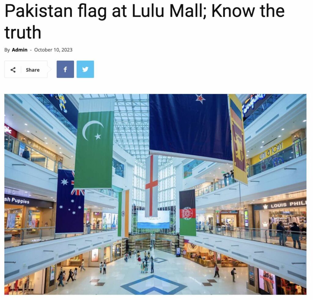 పాకిస్తాన్ జెండాని భారతీయ జెండా కంటే ఎత్తులో లులు మాల్ కొచ్చిలో ప్రదర్శించారని చెప్తూ కొన్ని ఫోటోలను సోషల్ మీడియాలో షేర్ చేస్తున్నారు, “FLAG కోడ్ ప్రకారం త్రివర్ణ పతాకం పైన, దానికంటే ఎత్తుగా లేదా పక్కన ఏ ఇతర జెండాను ఉంచకూడదు” అని కూడా ఈ ఫోటోలని షేర్ చేస్తూ క్లెయిమ్ చేస్తున్నారు. ఇందులోని నిజానిజాలు ఏంటో ఇప్పుడు చూద్దాం.
