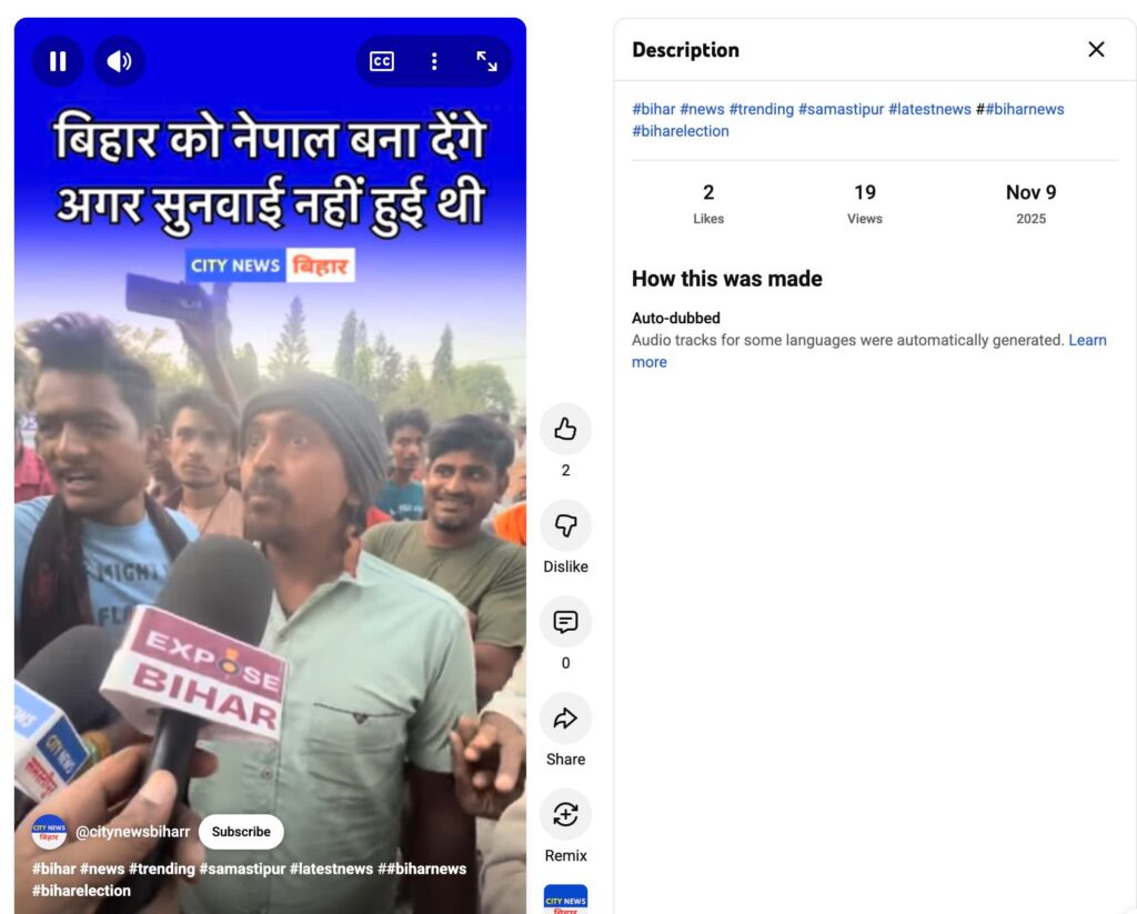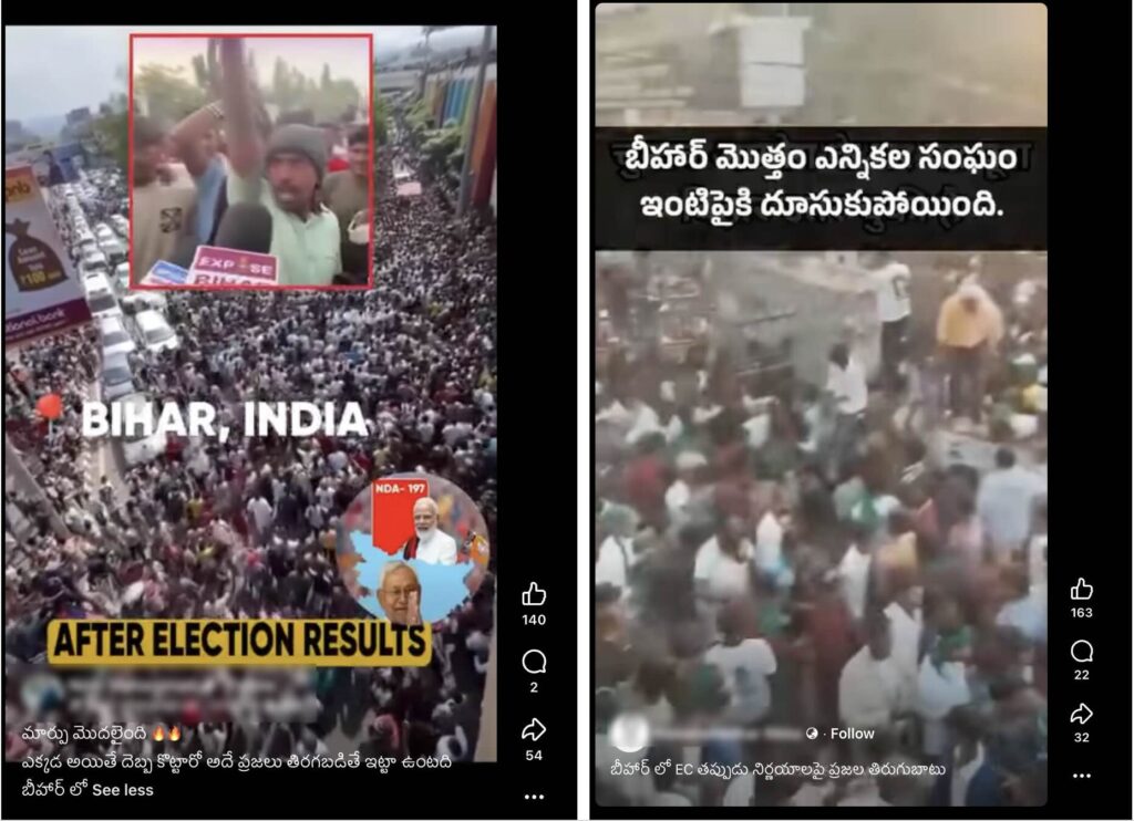 చివరగా, 14 నవంబర్ 2025న ECI ప్రకటించిన 2025 బీహార్ అసెంబ్లీ ఎన్నికల ఫలితాలకు వ్యతిరేకంగా బీహార్ ప్రజలు భారీ నిరసనలు నిర్వహిస్తున్నారని పేర్కొంటూ సంబంధం లేని వీడియోలను షేర్ చేస్తున్నారు.