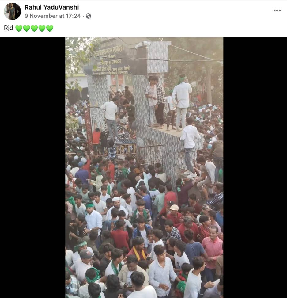 ఈ వీడియో RJD అభ్యర్థి కేసరి లాల్ యాదవ్ 09 నవంబర్ 2025న బీహార్లోని నహాస్ రూపౌలిలోని ఖంగ్రైత హై స్కూల్ సమీపంలో నిర్వహించిన ఎన్నికల ప్రచార సభకు సంబంధించింది అంటూ పలువురు సోషల్ మీడియాలో పేర్కొన్నారు (ఇక్కడ, ఇక్కడ) పేర్కొన్నారు. అలాగే ఈ ఈ వీడియోలో RJD పార్టీ జెండాలను మనం చూడవచ్చు. అయితే, మేము ఈ వీడియో కేసరి లాల్ యాదవ్ ఎన్నికల సభకు సంబంధించినదా, లేదా అని మేము స్వతంత్రంగా ధృవీకరించలేము.