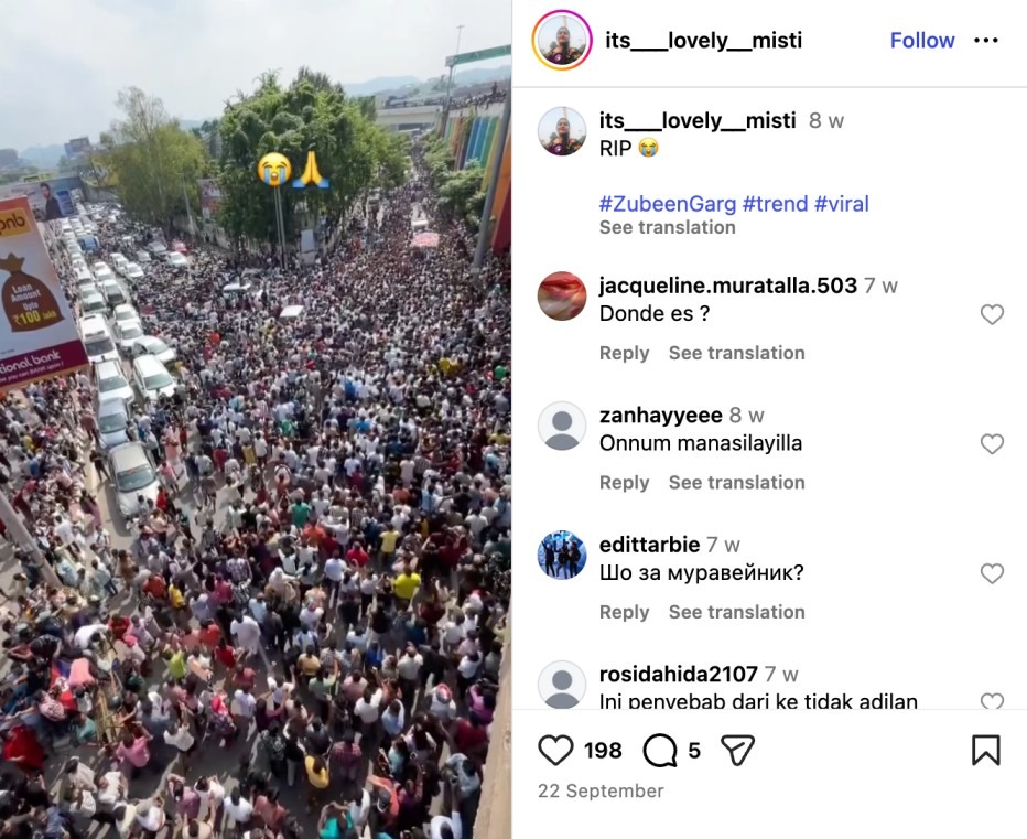 తదుపరి మొదటి వైరల్ వీడియోకు సంబంధించిన వివరాల కోసం, ఈ వీడియో యొక్క కీఫ్రేములను రివర్స్ ఇమేజ్ సెర్చ్ చేయగా, ఈ వీడియో 14 నవంబర్ 2025న బీహార్ అసెంబ్లీ ఎన్నికల ఫలితాలు ప్రకటించక ముందే ఇంటర్నెట్లో అందుబాటులో ఉందని తెలిసింది. ఇవే దృశ్యాలను సెప్టెంబర్ 2025లో పలువురు సోషల్ మీడియాలో పోస్టు చేస్తూ, సెప్టెంబర్ 2025లో మరణించిన ప్రముఖ అస్సామీ గాయకుడు జుబీన్ గార్గ్ అంతిమయాత్రకు సంబంధించినవి అని పేర్కొన్నారు (ఇక్కడ, ఇక్కడ, ఇక్కడ, & ఇక్కడ). నాగాలాండ్ పర్యాటక, ఉన్నత విద్యాశాఖ మంత్రి కూడా జుబీన్ గార్గ్ కు నివాళులర్పిస్తూ ఇదే వీడియోను షేర్ చేశారు. జుబీన్ గార్గ్ 19 సెప్టెంబర్ 2025న సింగపూర్లో మరణించారు.