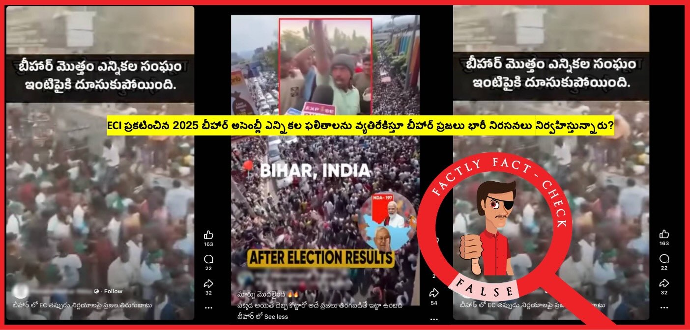 ఫాక్ట్(నిజం): 14 నవంబర్ 2025న ECI ప్రకటించిన 2025 బీహార్ అసెంబ్లీ ఎన్నికల ఫలితాలను వ్యతిరేకిస్తూ బీహార్ ప్రజలు భారీగా నిరసనలు చేసినట్లు ఎటువంటి రిపోర్ట్స్/ఆధారాలు లేవు. అలాగే, ఈ వైరల్ వీడియోలు కూడా 2025న బీహార్ అసెంబ్లీ ఎన్నికల ఫలితాలు ప్రకటించక ముందు నుండే ఇంటర్నెట్లో ఉన్నాయి. కావున పోస్టు ద్వారా చెప్పేది తప్పు.