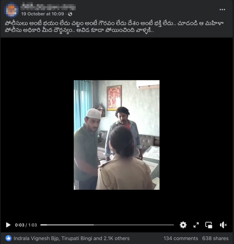 ముస్లిం స్కల్ క్యాప్ ధరించిన ఒక వ్యక్తి ఒక మహిళా పోలీస్ అధికారితో దురుసుగా ప్రవర్తిస్తూ, వాదిస్తున్న వీడియో (ఇక్కడ, ఇక్కడ, ఇక్కడ, ఇక్కడ) ఒకటి సోషల్ మీడియాలో షేర్ చేయబడుతోంది. ఈ వీడియోని ‘పోలీసులు అంటే భయం లేదు చట్టం అంటే గౌరవం లేదు దేశం అంటే భక్తి లేదు.. చూడండి ఆ మహిళా పోలీసు అధికారి మీద దౌర్జన్యం.. ఆవిడ కూడా పోయించింది వాళ్ళకి..’ అని క్లెయిమ్ చేస్తూ సోషల్ మీడియాలో షేర్ చేస్తున్నారు. అసలు ఈ క్లెయిమ్ వెనుక ఎంత నిజం ఉందో ఈ ఆర్టికల్ ద్వారా చూద్దాం.