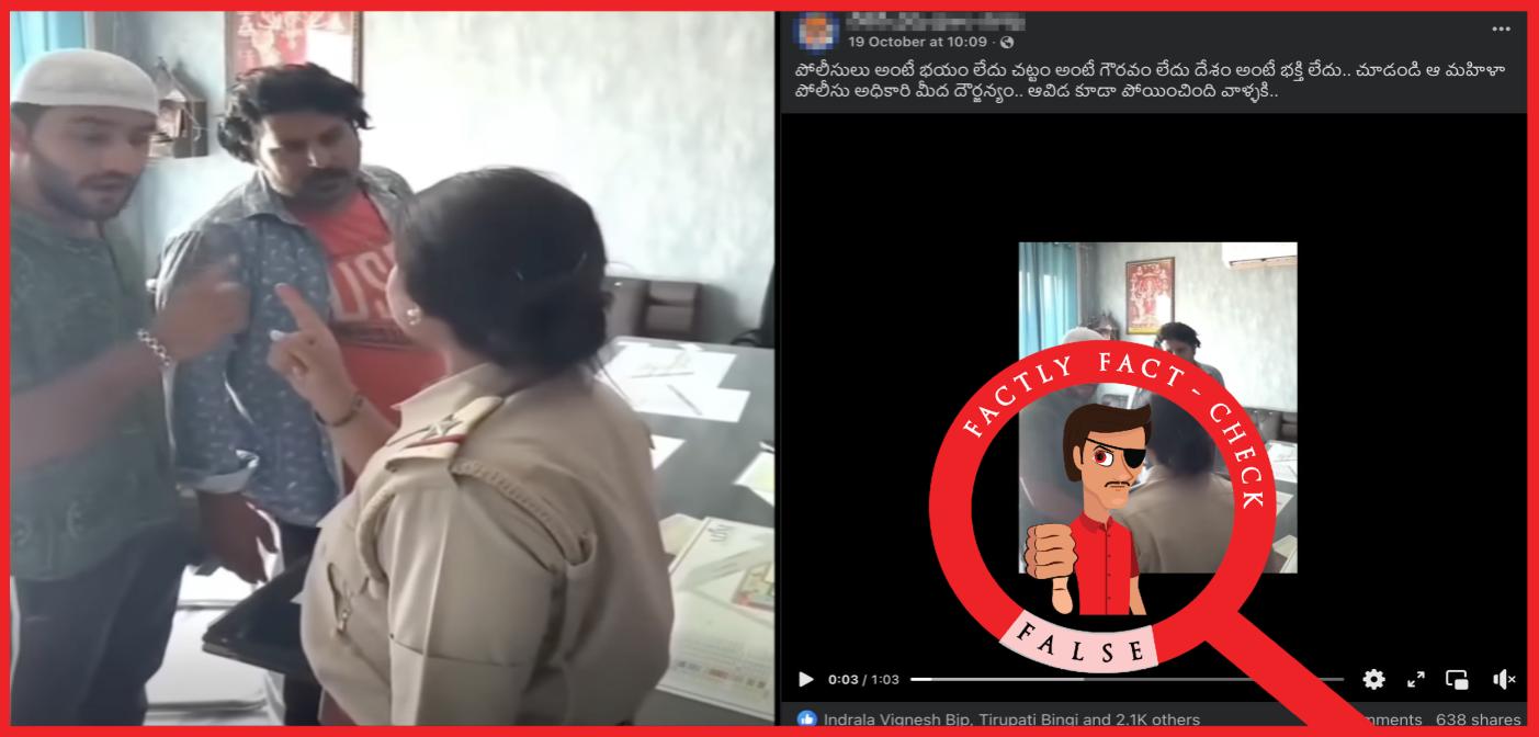ముస్లిం స్కల్ క్యాప్ ధరించిన ఒక వ్యక్తి ఒక మహిళా పోలీస్ అధికారితో దురుసుగా ప్రవర్తిస్తూ, వాదిస్తున్న వీడియో (ఇక్కడ, ఇక్కడ, ఇక్కడ, ఇక్కడ) ఒకటి సోషల్ మీడియాలో షేర్ చేయబడుతోంది. ఈ వీడియోని ‘పోలీసులు అంటే భయం లేదు చట్టం అంటే గౌరవం లేదు దేశం అంటే భక్తి లేదు.. చూడండి ఆ మహిళా పోలీసు అధికారి మీద దౌర్జన్యం.. ఆవిడ కూడా పోయించింది వాళ్ళకి..’ అని క్లెయిమ్ చేస్తూ సోషల్ మీడియాలో షేర్ చేస్తున్నారు. అసలు ఈ క్లెయిమ్ వెనుక ఎంత నిజం ఉందో ఈ ఆర్టికల్ ద్వారా చూద్దాం.