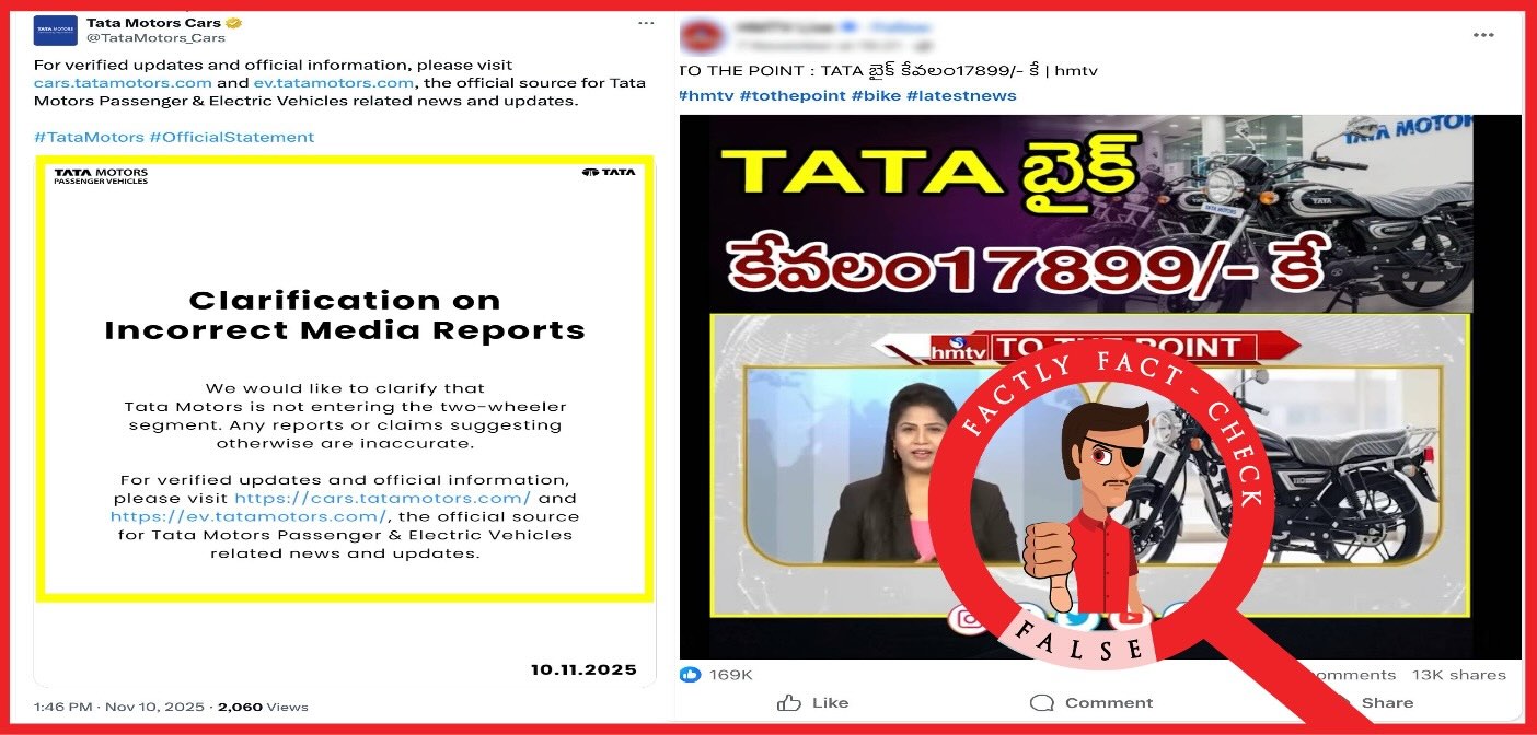 ఫాక్ట్(నిజం): టాటా మోటార్స్ కేవలం ₹17,899లకే 200 సీసీ హైబ్రిడ్ బైక్ను లాంచ్ చేయలేదు. టాటా మోటార్స్ మార్కెట్లోకి ఏ ద్విచక్ర వాహనాన్ని విడుదల చేయలేదు. ఈ వార్త సోషల్ మీడియాలో వైరల్ కావడంతో, టాటా మోటార్స్ తాము ద్విచక్ర వాహన విభాగంలోకి ప్రవేశించడం లేదని స్పష్టం చేసింది. కావున పోస్టు ద్వారా చెప్పేది తప్పు.