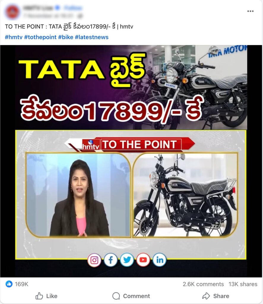“టాటా మోటార్స్ సాధారణ వినియోగదారుల కోసం కేవలం ₹17,899లకే 200 సీసీ హైబ్రిడ్ బైక్ను లాంచ్ చేసింది, భారత వాహన మార్కెట్లో టాటా మోటార్స్ మరోసారి కొత్త చరిత్ర సృష్టించింది” అని చెప్తూ ఉన్న పోస్ట్ ఒకటి సోషల్ మీడియాలో వైరల్ అవుతోంది (ఇక్కడ, ఇక్కడ, ఇక్కడ, ఇక్కడ, ఇక్కడ, ఇక్కడ, & ఇక్కడ). ప్రముఖ తెలుగు మీడియా సంస్థ HMTV కూడా ఇదే విషయాన్ని రిపోర్ట్ చేస్తూ కథనం ప్రచురించింది (ఇక్కడ, ఇక్కడ, ఇక్కడ). ఈ కథనం ద్వారా అందులో ఎంత నిజముందో చూద్దాం.