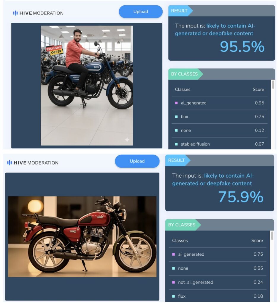 ఇకపోతే వైరల్ పోస్ట్లలో షేర్ చేయబడిన టాటా మోటార్సైకిళ్ల ఫోటోలు AI ద్వారా రూపొందించబడ్డాయి. గతంలో కూడా టాటా కంపెనీ ₹3,249 కు కొత్త ఎలక్ట్రిక్ సైకిల్ను విడుదల చేసిందని, టాటా మోటార్స్ 624cc ఇంజిన్ & 30 కి.మీ మైలేజీతో కొత్త నానో కారును విడుదల చేయబోతోందని పేర్కొంటూ పలు పోస్ట్లు వైరల్ కాగా, అందులో నిజం లేదని చెప్తూ Factly ప్రచురించిన ఫాక్ట్-చెక్ కథనాలను ఇక్కడ & ఇక్కడ చూడవచ్చు.