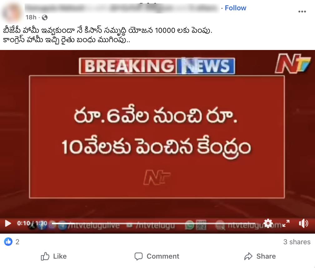 ఫాక్ట్(నిజం): ప్రధానమంత్రి-కిసాన్ సమ్మాన్ నిధి స్కీమ్ కింద ఇస్తున్న ఆర్థిక సహాయాన్ని ₹6,000 నుంచి ₹10,000కు పెంచారని, ఇది 01 జనవరి 2026 నుంచి అమల్లోకి వస్తుందనే వాదనలో నిజం లేదు. ప్రధాన్ మంత్రి కిసాన్ సమ్మాన్ నిధి స్కీమ్ కింద, ప్రభుత్వం ప్రస్తుతం అర్హత కలిగిన ప్రతి కుటుంబానికి సంవత్సరానికి ₹6,000 ఆర్థిక సహాయం అందిస్తోంది. ఈ వీడియోను NTV తెలుగు ఛానల్ ఇటీవల ప్రసారం చేయలేదు; వారు ఈ వీడియోను 01 జనవరి 2025న ప్రచురించారు. కావున పోస్టు ద్వారా చెప్పేది తప్పు.