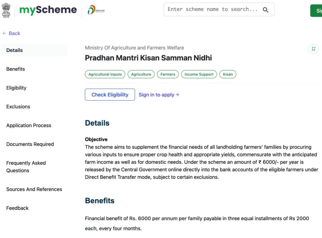 తదుపరి, మేము భారత ప్రభుత్వ స్కీమ్‌ల గురించి సమాచారం అందించే MyScheme వెబ్‌సైట్‌ను సమీక్షించగా, ప్రధానమంత్రి కిసాన్ సమ్మాన్ నిధి స్కీమ్ కింద ప్రస్తుతం ప్రతి అర్హత కలిగిన కుటుంబానికి ప్ప్రభుత్వం సంవత్సరానికి ₹6,000 ఆర్థిక సహాయాన్ని, ప్రతి నాలుగు నెలలకు ఒకసారి ₹2,000 మూడు విడతలుగా అందిస్తోంది అని మేము కనుగొన్నాము. చివరగా ఈ స్కీమ్‌ కింద 19 నవంబర్ 2025 న 21వ ఇన్‌స్టాల్మెంట్‌ కింద రూ. 2000 అందించారు.