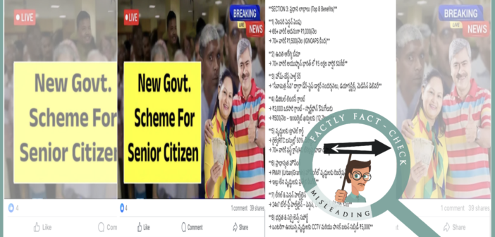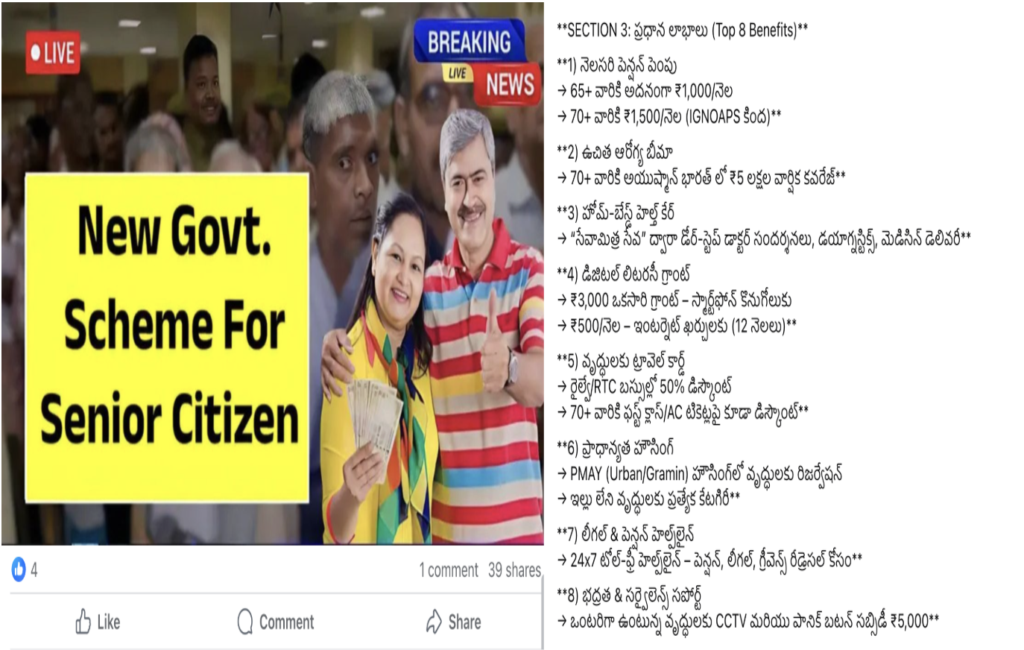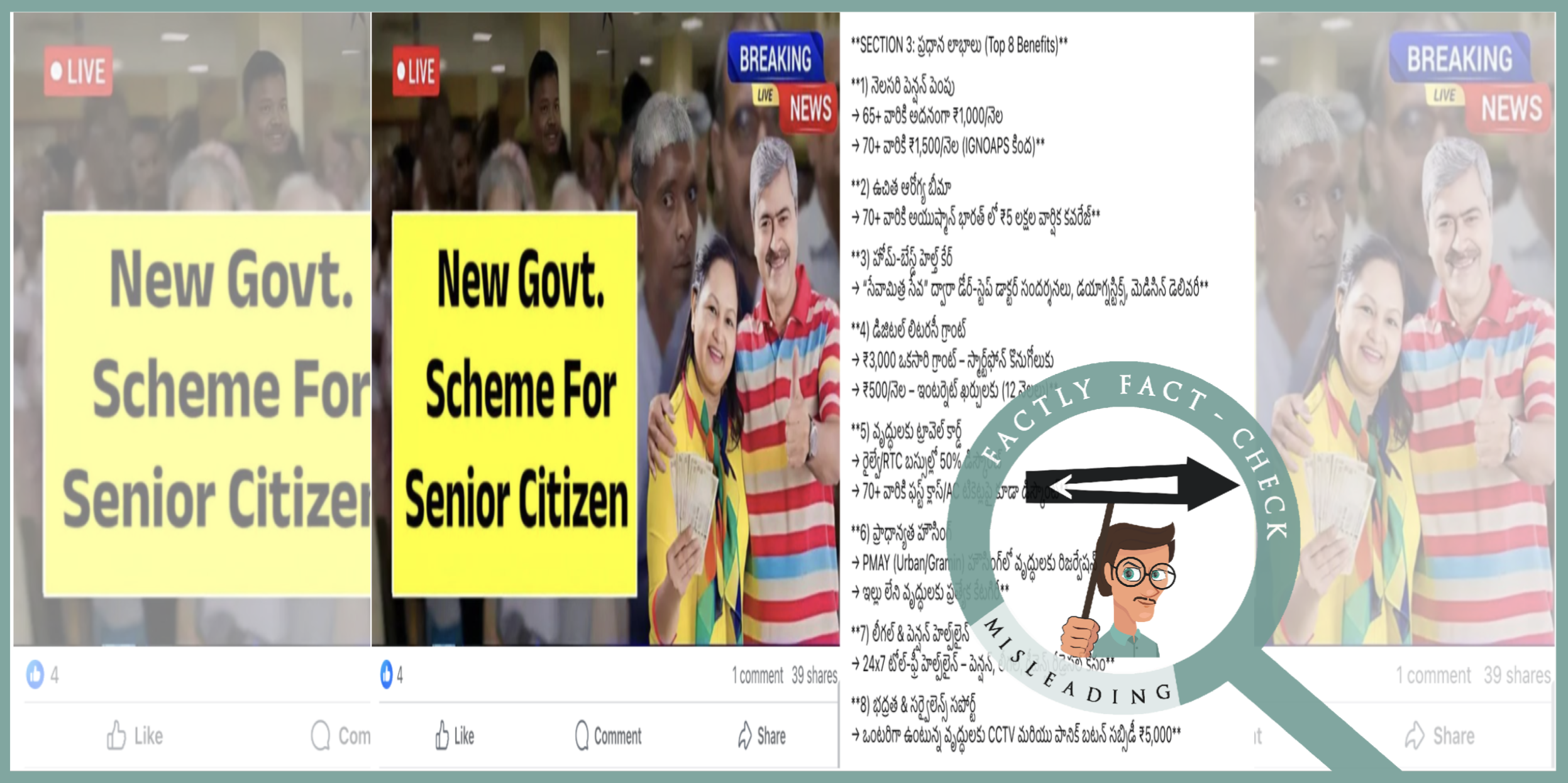 “భారత ప్రభుత్వం 21 నవంబర్ 2025న ప్రకటించిన ‘2025 సీనియర్ స్కీం అప్డేట్’ వృద్ధులకు మరింత ఆర్థిక భద్రత, ఆరోగ్య సౌకర్యాలు, డిజిటల్ లిటరసీ, ప్రయాణ సబ్సిడీలు, నివాస భద్రత, హెల్ప్లైన్ సేవలు అందించడానికి రూపొందించిన సమగ్ర పథకం” అంటూ పలు ఉప స్కీములను ప్రస్తావిస్తూ సోషల్ మీడియాలో (ఇక్కడ, ఇక్కడ, ఇక్కడ) షేర్ చేస్తున్నారు. దీని వెనుక ఎంత నిజముందో ఈ కథనం ద్వారా తెలుసుకుందాం.