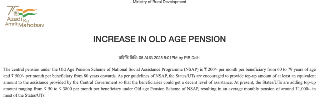 కానీ, నేషనల్ సోషల్ అసిస్టెన్స్ ప్రోగ్రాం (NSAP) వృద్ధాప్య పెన్షన్ పథకం కింద కేంద్రం, 60 నుండి 79 సంవత్సరాల వయస్సు గల లబ్ధిదారునికి నెలకు ₹ 200/-, 80 సంవత్సరాలు పైబడిన లబ్ధిదారునికి నెలకు ₹ 500/- అందిస్తుంది. ఈ పథకం ప్రకారం, రాష్ట్రాలు/కేంద్ర పాలిత ప్రాంతాలు కేంద్ర ప్రభుత్వం అందించే సహాయానికి టాప్-అప్ మొత్తాన్ని అదనంగా అందించవచ్చు.