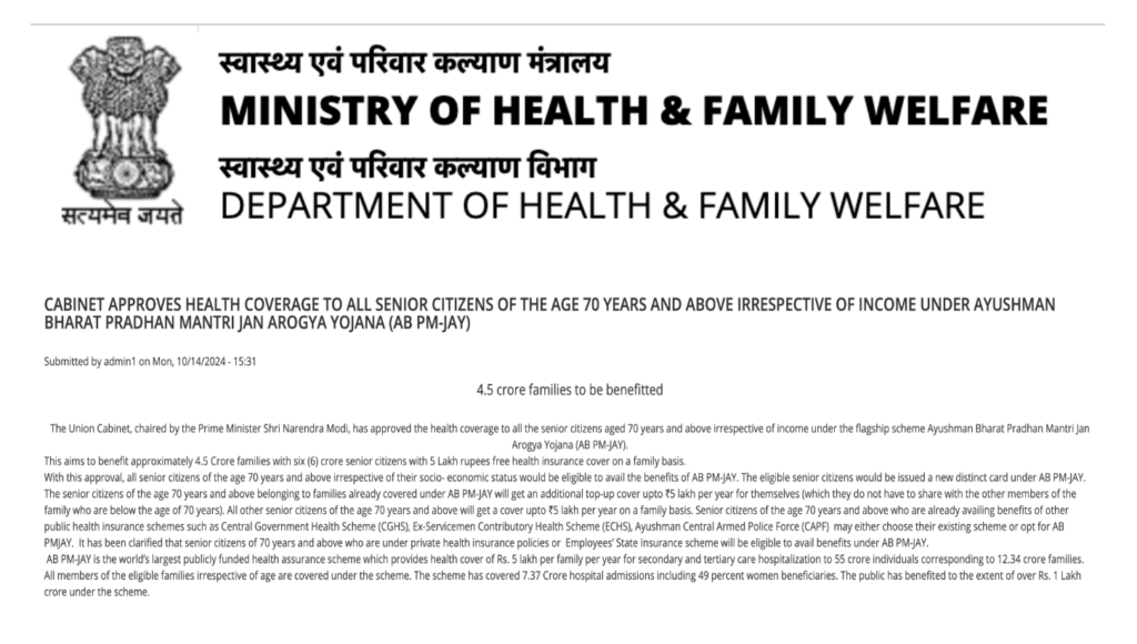 కానీ, సెప్టెంబర్ 2024లోనే కేంద్ర మంత్రివర్గం ఆయుష్మాన్ భారత్ PM-JAY ఆరోగ్య పథకం యొక్క ప్రధాన విస్తరణను ఆమోదించింది. దీని ప్రకారం ఆదాయంతో సంబంధం లేకుండా 70 ఏళ్లు, అంతకంటే ఎక్కువ వయస్సు ఉన్న సీనియర్ సిటిజన్లకు ₹5 లక్షల వరకు కొత్త “వే వందన కార్డ్”తో వార్షిక ఆరోగ్య కవరేజీని అందిస్తుంది. ఇది ఇప్పటికే PM-JAYలో ఉన్నవారికి అదనపు ₹5 లక్షల టాప్-అప్ నిధులను అందిస్తుంది మరియు ఇతర సీనియర్లకు కుటుంబ ప్రాతిపదికన ₹5 లక్షలు అందిస్తుంది.