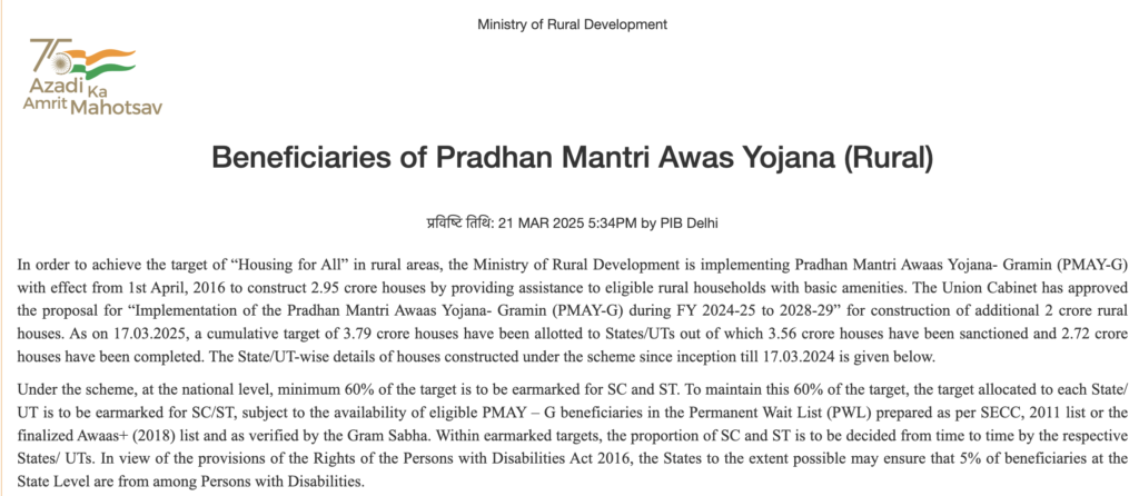 గ్రామసభలచే ధృవీకరించబడిన SECC 2011 డేటా ఆధారంగా అత్యంత దుర్బలమైన గ్రామీణ కుటుంబాలకు PMAY గ్రామీణ్ (PMAY-G) ప్రాధాన్యత ఇస్తుందని మార్చ్ 2025లో కేంద్రం ప్రకటించింది. కానీ ఈ రెండు పథకాలు వృద్ధులకు ప్రత్యేక “రిజర్వేషన్ కోటా” కల్పించదు.