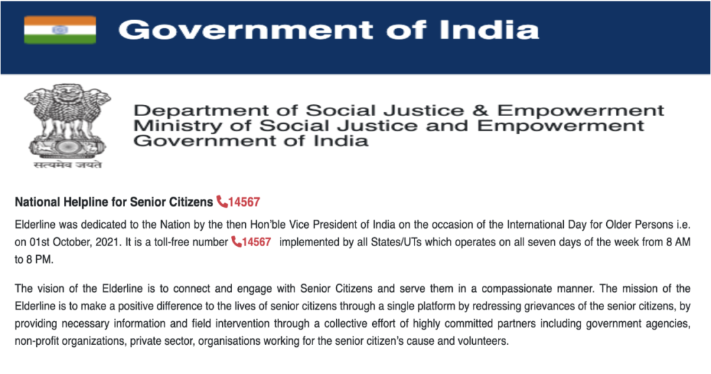 కేంద్రం సీనియర్ సిటిజన్ల కోసం ఎల్డర్ లైన్ అనే ప్రత్యేక హెల్ప్లైన్ నంబర్ – 14567ను అంతర్జాతీయ వృద్ధుల దినోత్సవం సందర్భంగా 2021లో ఆరంభించింది. ఇది సీనియర్ సిటిజన్ల ఫిర్యాదులను పరిష్కరించడానికి, అవసరమైన సమాచారం అందించే ఒకే వేదిక.