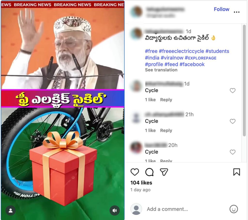 కేంద్ర ప్రభుత్వం విద్యార్థులకు ఉచితంగా ఎలక్ట్రిక్ సైకిళ్లను (Free Electric Cycles) అందిస్తోంది అంటూ ప్రధాని మోదీ మాట్లాడుతున్న పలు వీడియోలు సోషల్ మీడియాలో వైరల్ అవుతున్నాయి (ఇక్కడ, ఇక్కడ, & ఇక్కడ). ఈ వీడియోలలో ప్రధాని మోదీ, స్కూల్ విద్యార్థులు అందరికీ ఉచితంగా సైకిళ్లను అందిస్తానని చెప్పడం మనం చూడవచ్చు. ఈ కథనం ద్వారా అందులో ఎంత నిజముందో చూద్దాం.