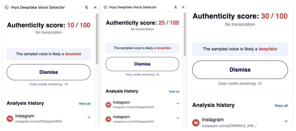 ఈ రెండు ప్రసంగాల్లోనూ, కేంద్ర ప్రభుత్వం విద్యార్థులకు ఉచిత విద్యుత్ సైకిళ్లను అందిస్తుందని ప్రధానమంత్రి మోదీ ప్రకటించలేదు. దీన్ని బట్టి అసలు వీడియోలకు AI జనరేటెడ్ ఆడియోను జోడించి ఈ వైరల్ వీడియోలను రూపొందించినట్లు అర్థమవుతుంది. తదుపరి, ఈ వైరల్ వీడియోలలోని ఆడియోను AI ఉపయోగించి రూపొందించబడిందా లేదా అని నిర్ధారించడానికి, ఈ వీడియోలను Resemble AI, & Hiya వంటి వివిధ AI-జనరేటెడ్ కంటెంట్ డిటెక్టింగ్ టూల్స్ ఉపయోగించి ఈ వీడియోలను పరిశీలించగా, ఈ వైరల్ వీడియోలలోని ఆడియోలు AI-జనరేటెడ్ ఆడియో కావచ్చని ఫలితాన్ని ఇచ్చాయి.