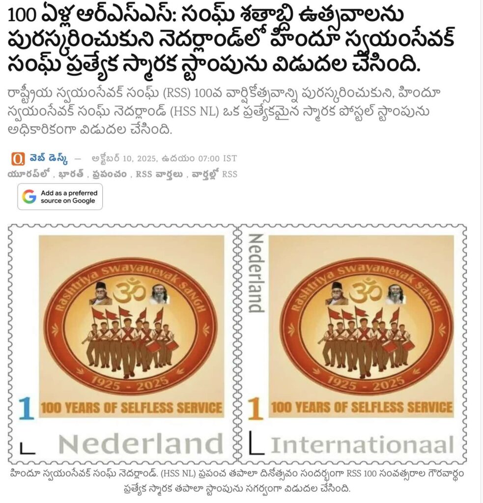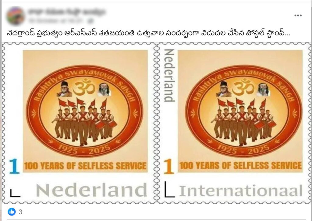 ఫాక్ట్(నిజం): రాష్ట్రీయ స్వయం సేవక్ సంఘ్ (RSS) శతజయంతి ఉత్సవాల సందర్భంగా నెదర్లాండ్స్ ప్రభుత్వం అధికారికంగా RSS స్మారక పోస్టల్ స్టాంప్ను (తపాలా బిళ్ల) విడుదల చేసిందనే వాదనలో నిజం లేదు. ఈ పోస్టల్ స్టాంప్ను, RSS శతాబ్ది ఉత్సవాలను పురస్కరించుకుని ప్రపంచ తపాలా దినోత్సవం సందర్భంగా 09 అక్టోబర్ 2025న నెదర్లాండ్స్లోని హిందూ స్వయంసేవక్ సంఘ్ (HSS NL) విడుదల చేసింది. నెదర్లాండ్స్ పోస్టల్ డిపార్ట్మెంట్ వెబ్సైట్లో ఎవరైనా తమకు కావలసిన ఫోటోలతో కూడిన పోస్టల్ స్టాంప్ను తయారు చేసుకోవచ్చు. కావున పోస్టు ద్వారా చెప్పేది తప్పుదోవ పట్టించే విధంగా ఉంది.