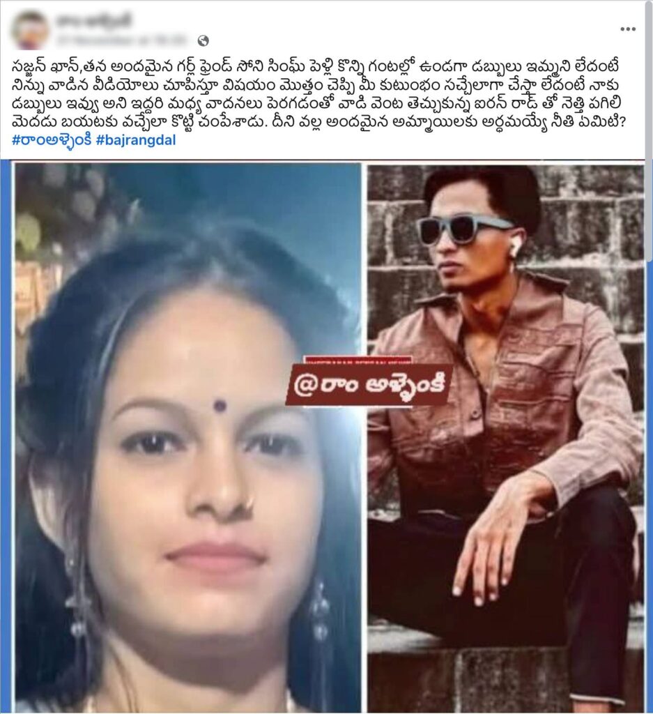 “సజ్జన్ ఖాన్,తన అందమైన గర్ల్ ఫ్రెండ్ సోని సింఘ్ పెళ్లి కొన్ని గంటల్లో ఉండగా డబ్బులు ఇమ్మని లేదంటే నిన్ను వాడిన వీడియోలు చూపిస్తూ విషయం మొత్తం చెప్పి మీ కుటుంబం సచ్చేలాగా చేస్తా లేదంటే నాకు డబ్బులు ఇవ్వు అని ఇద్దరి మధ్య వాదనలు పెరగడంతో వాడి వెంట తెచ్చుకున్న ఐరన్ రాడ్ తో నెత్తి పగిలి మెదడు బయటకు వచ్చేలా కొట్టి చంపేశాడు” అని చెప్తూ ఉన్న పోస్ట్ ఒకటి సోషల్ మీడియాలో వైరల్ అవుతోంది (ఇక్కడ, ఇక్కడ, & ఇక్కడ). ఈ కథనం ద్వారా అందులో ఎంత నిజముందో చూద్దాం.